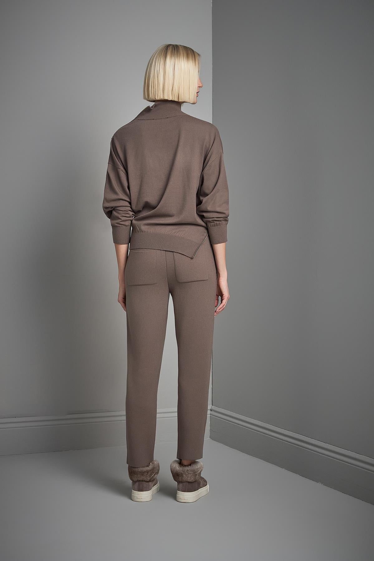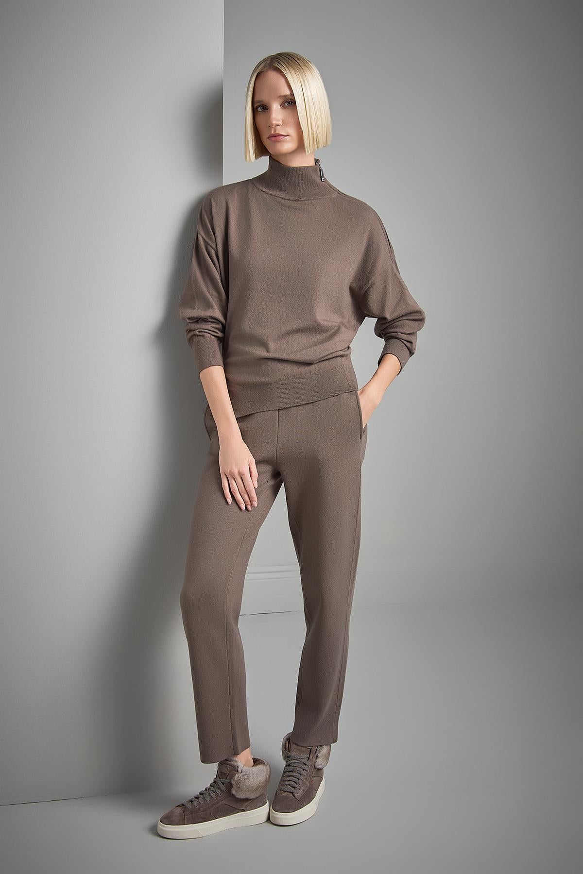 Fermuar Detaylı Dik Yaka Kahverengi Triko Kazak