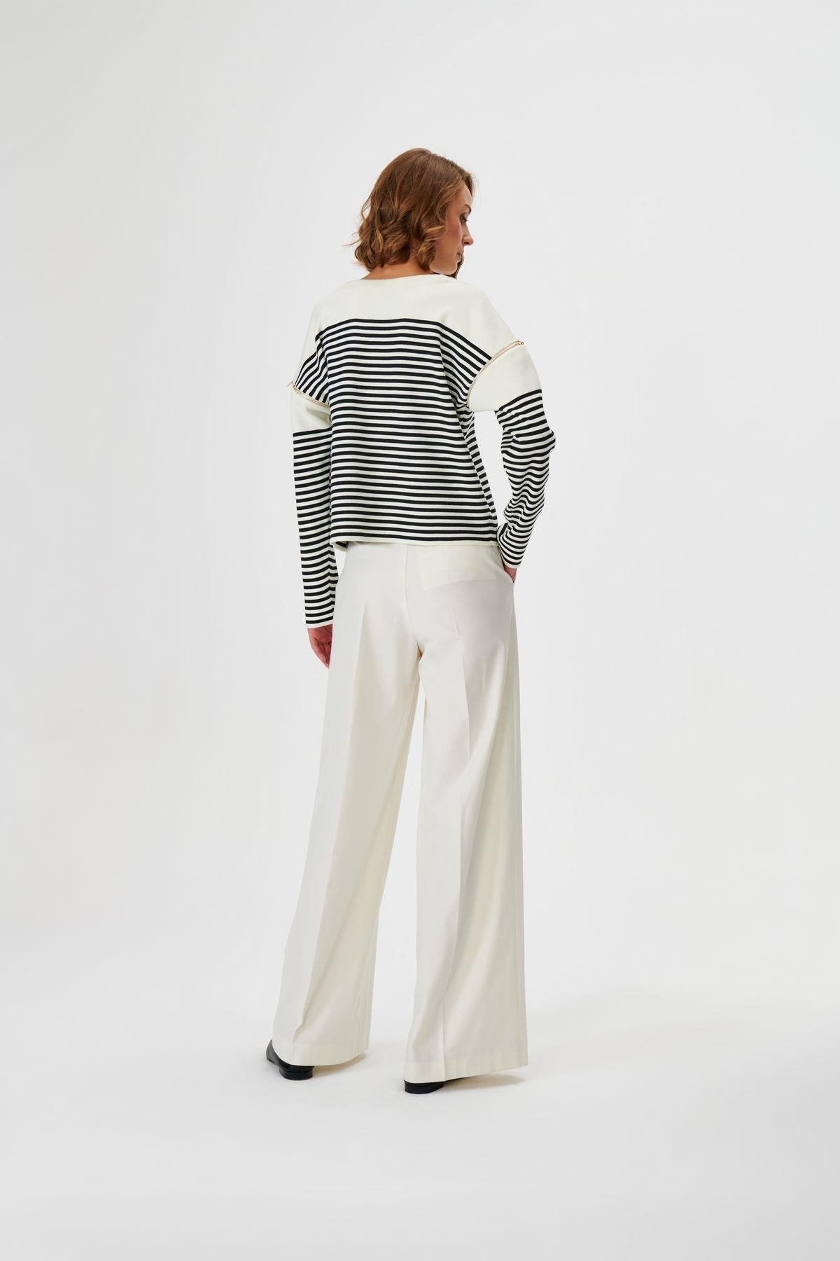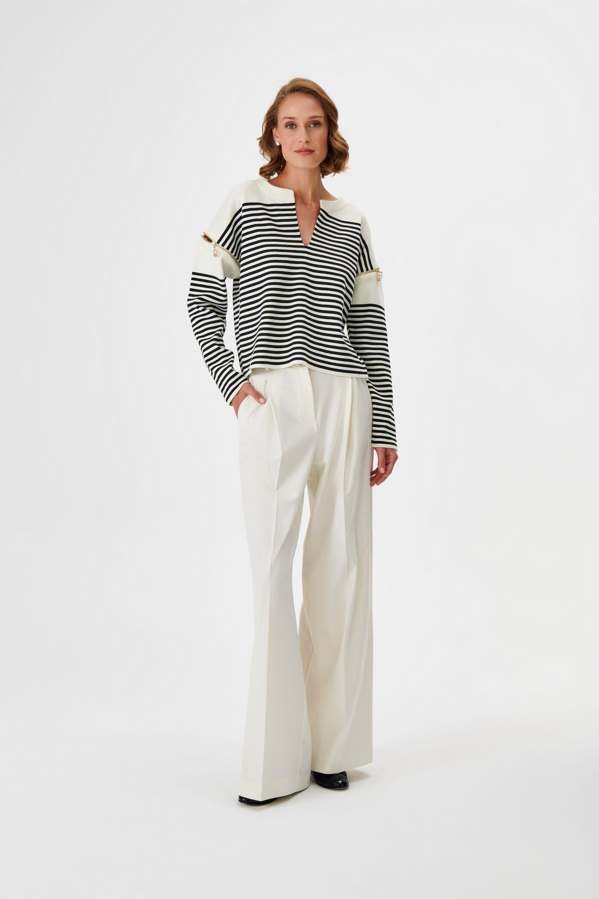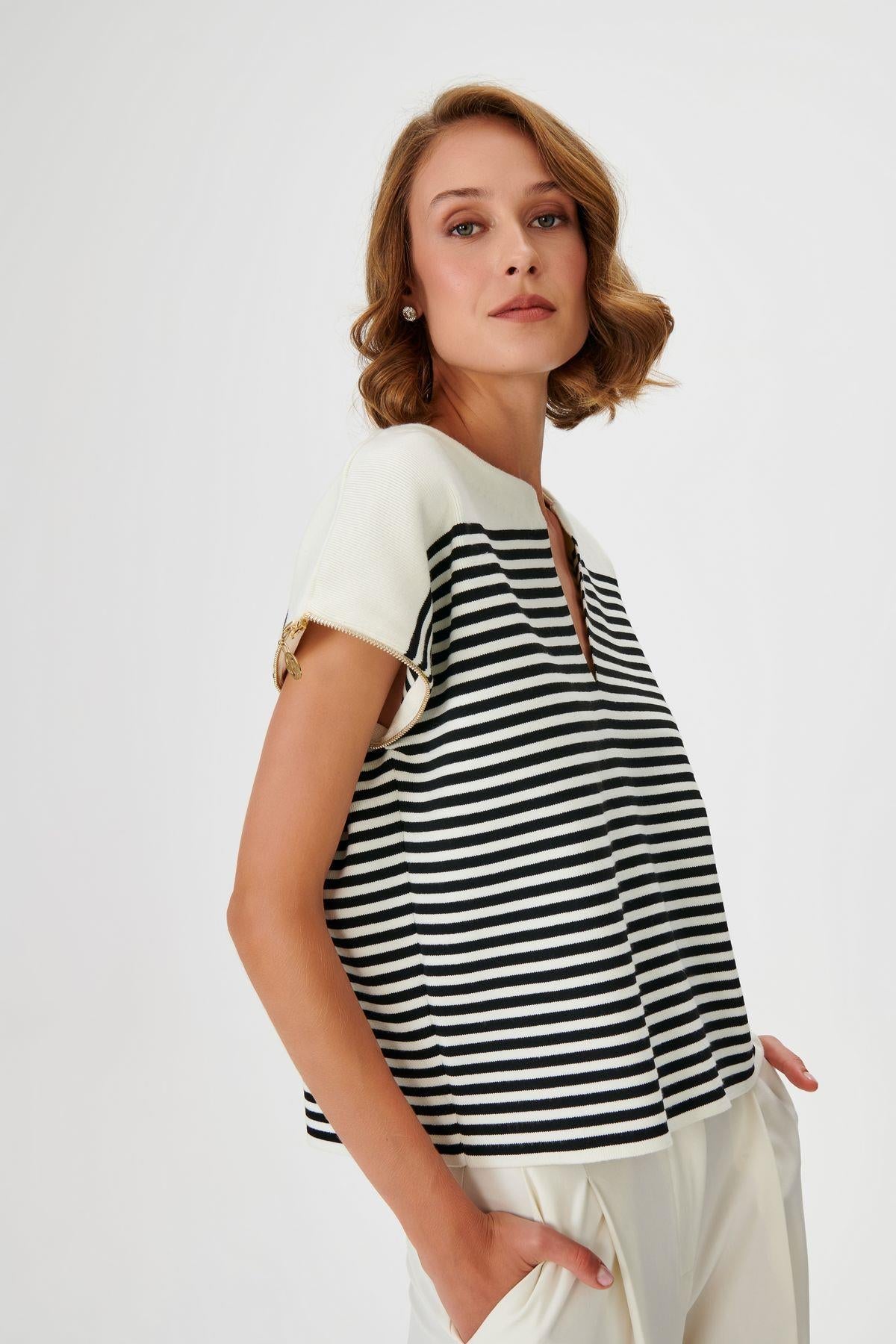 Fermuarlı Fonksiyonel Kol Çizgili Ekru Triko Kazak