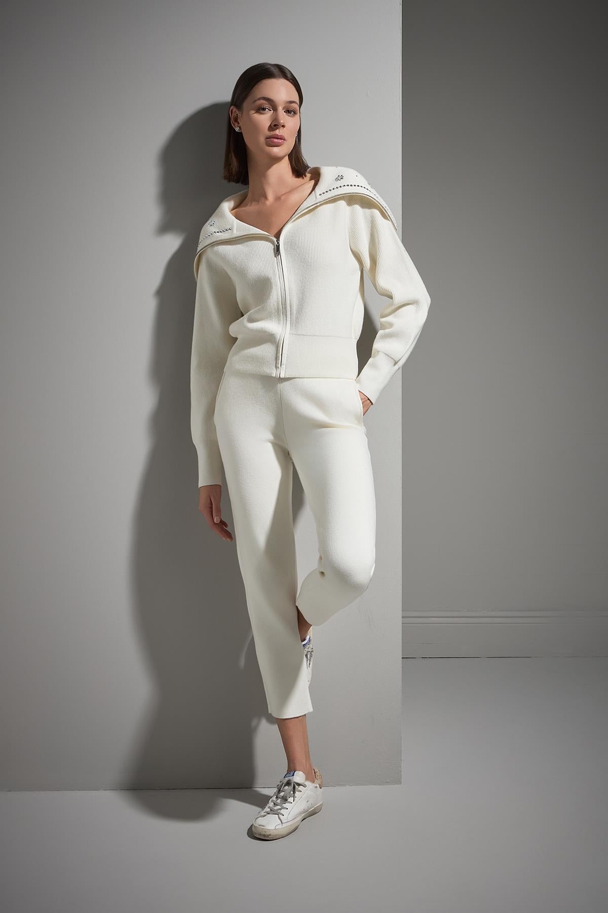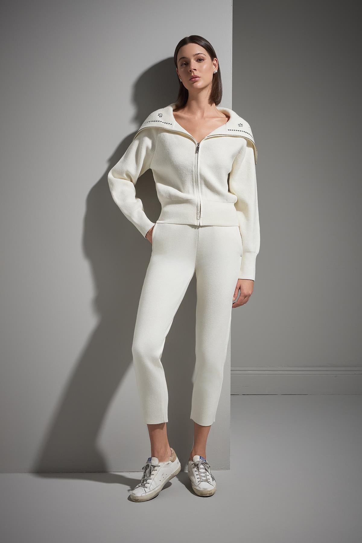 El işi Taş İşlemeli Fermuarlı Ekru Triko Hırka
