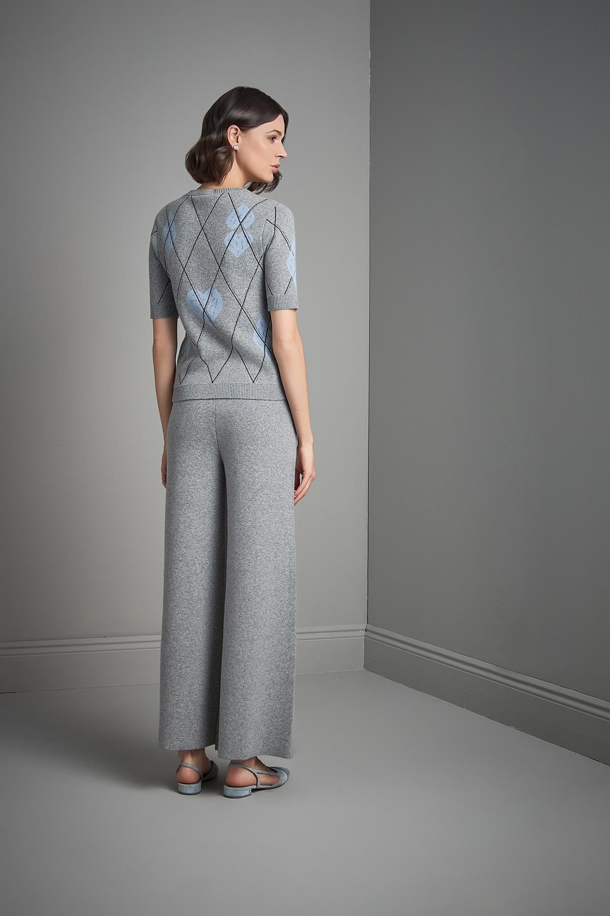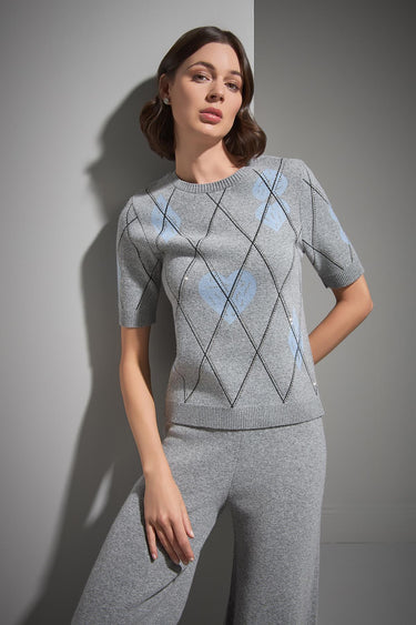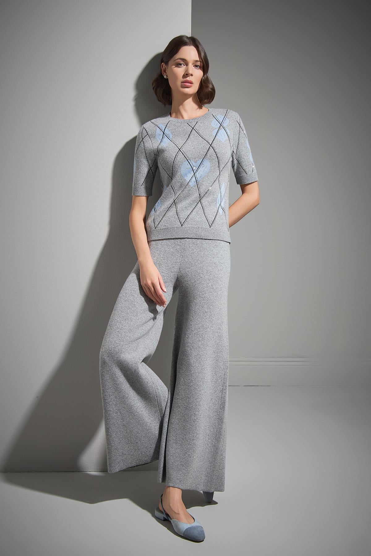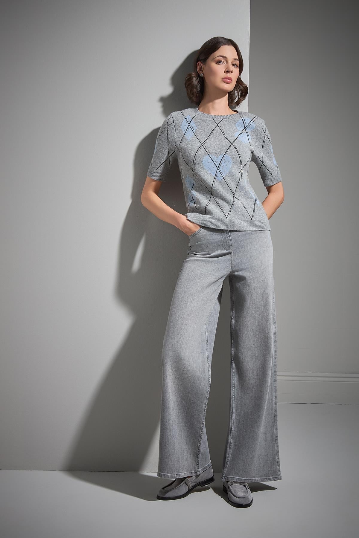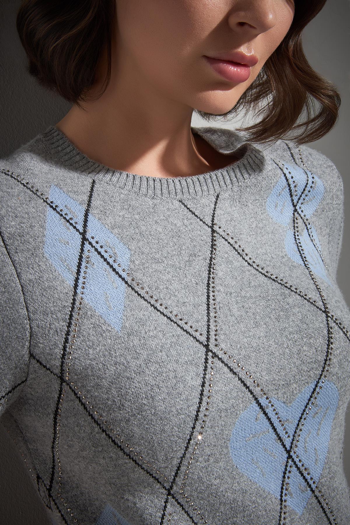 Baklava Desenli Taş Baskılı Gri Triko Kazak