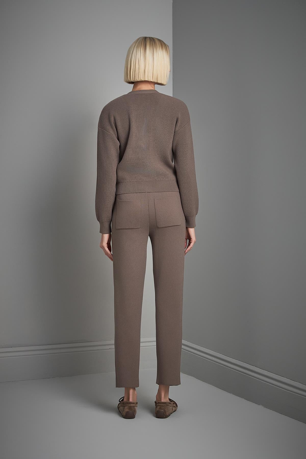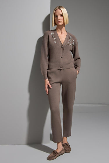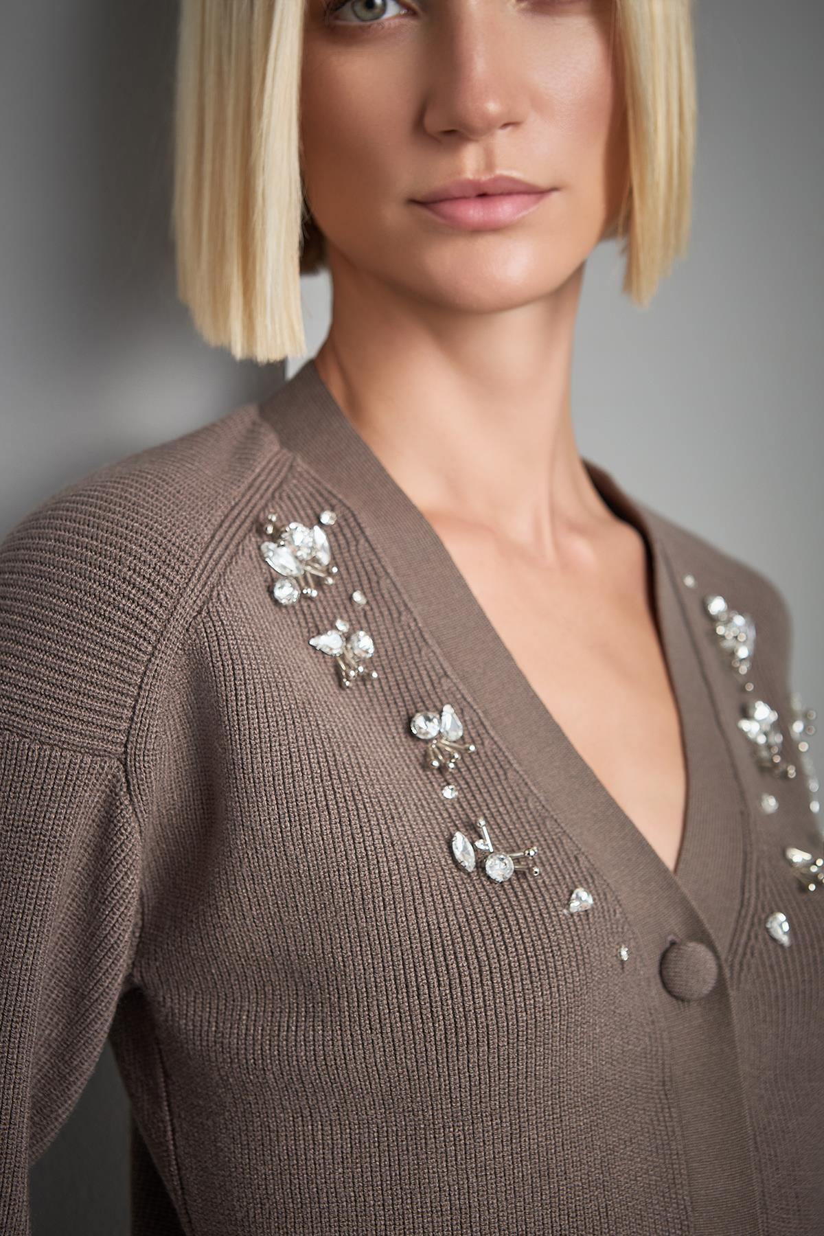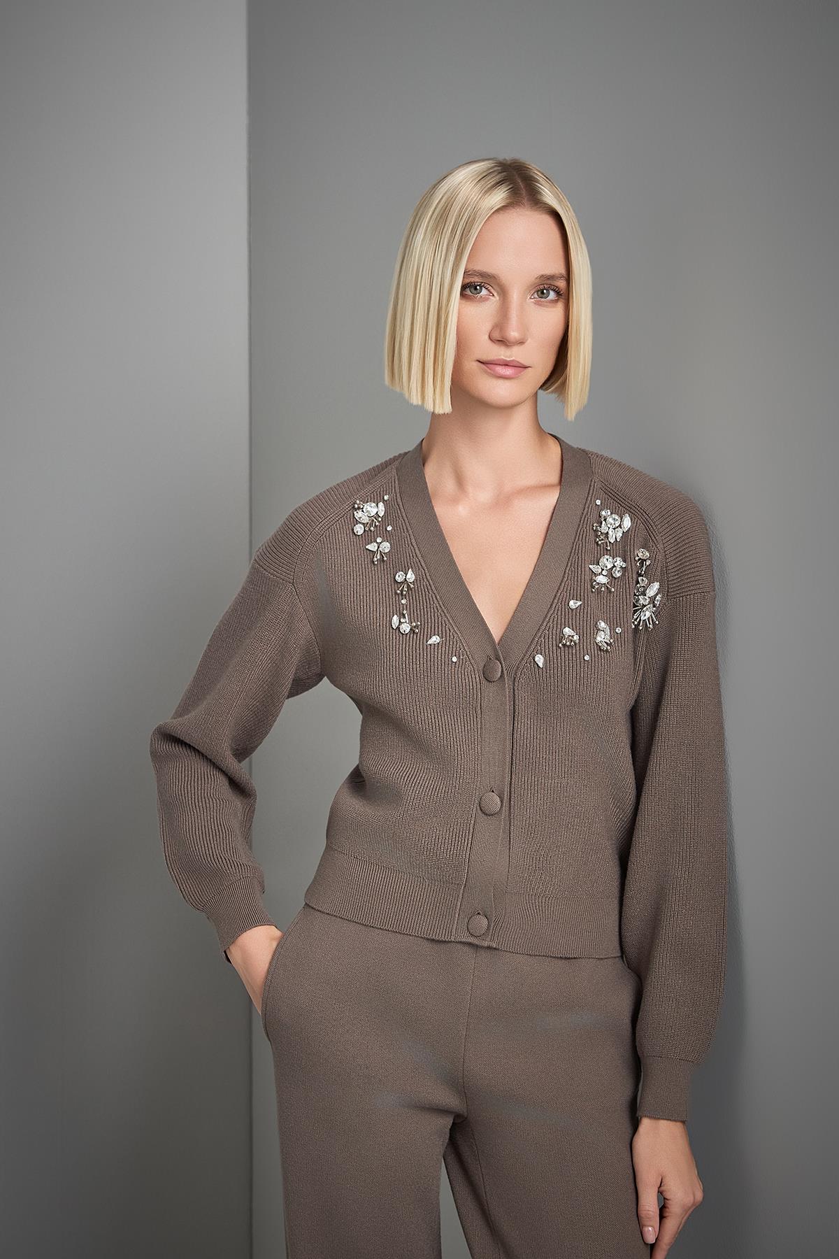 El İşi Taş İşlemeli Kahverengi Triko Hırka