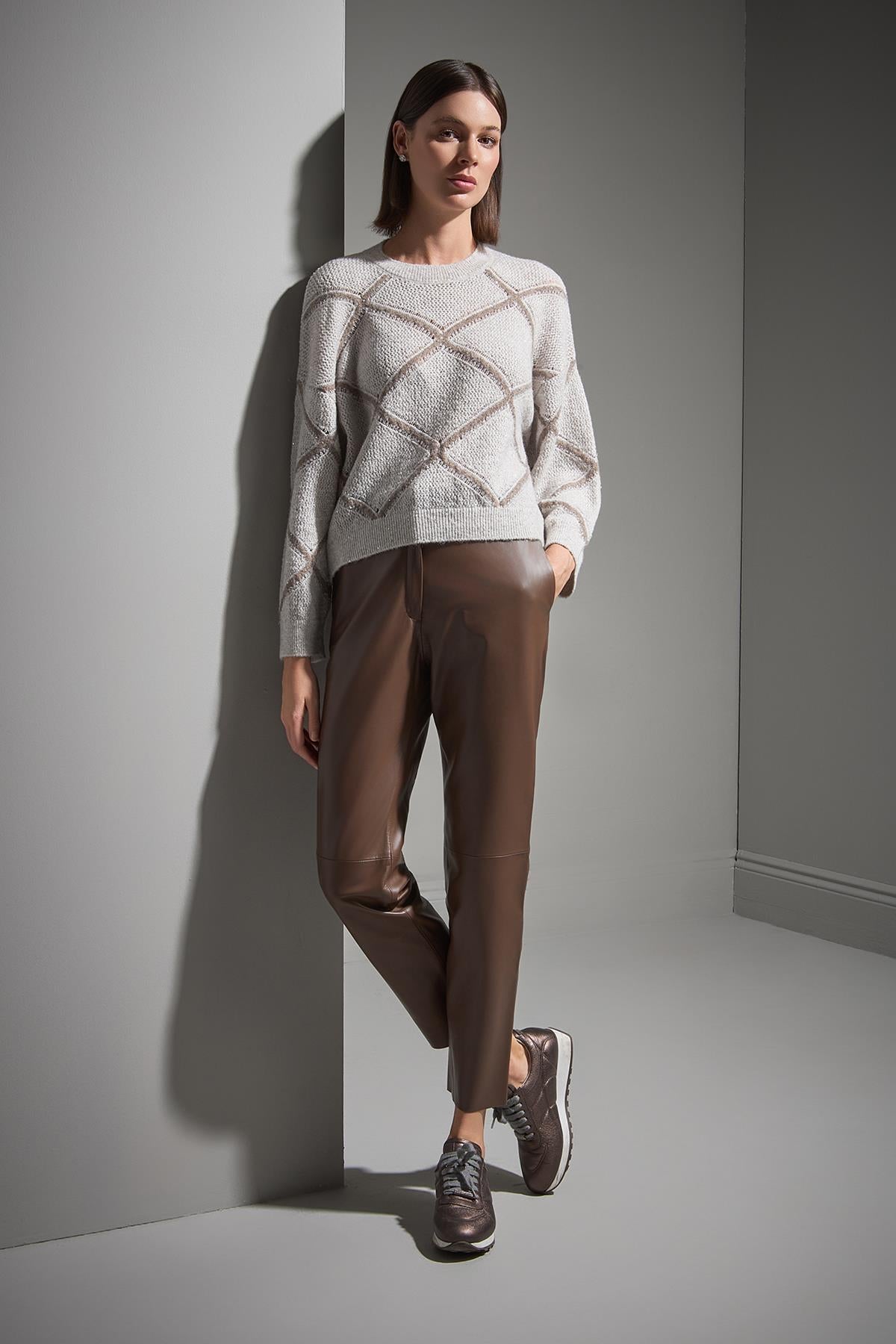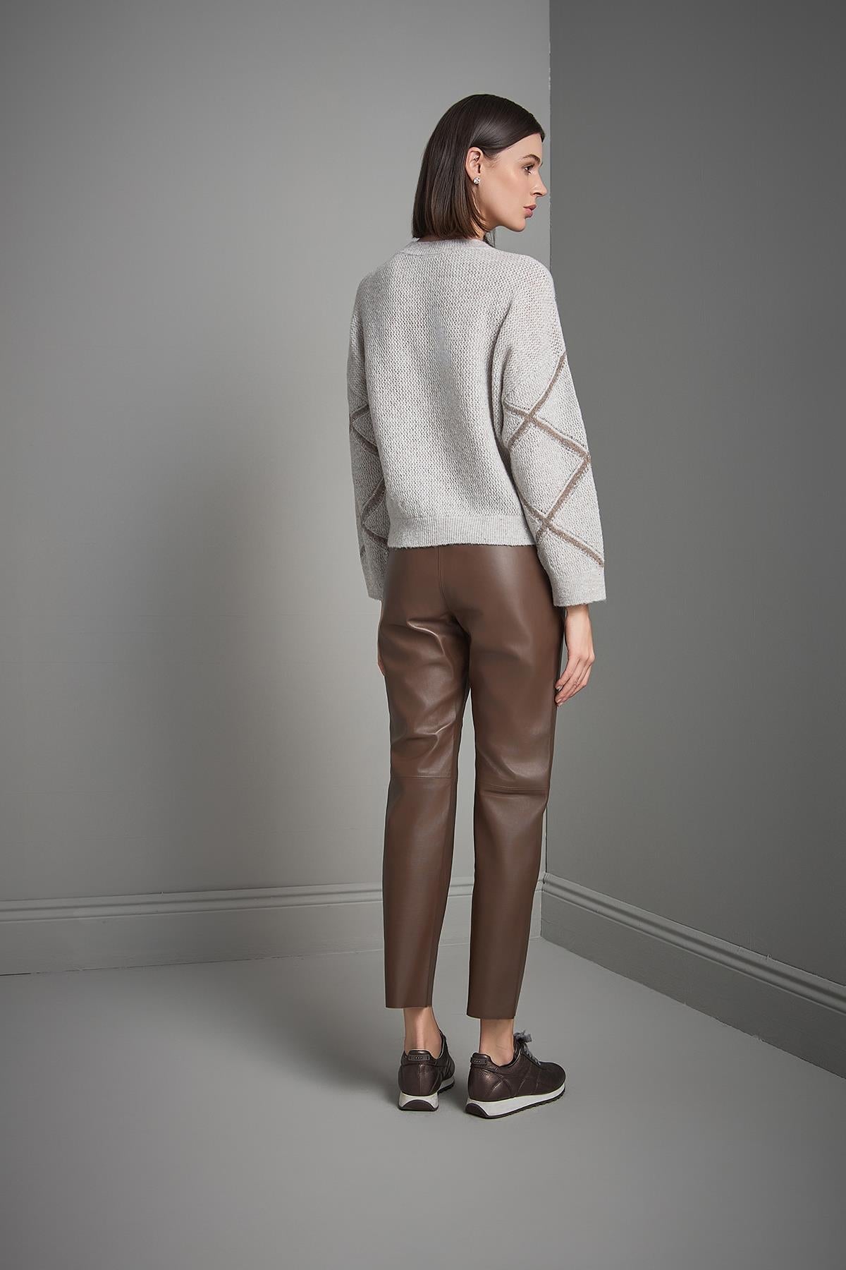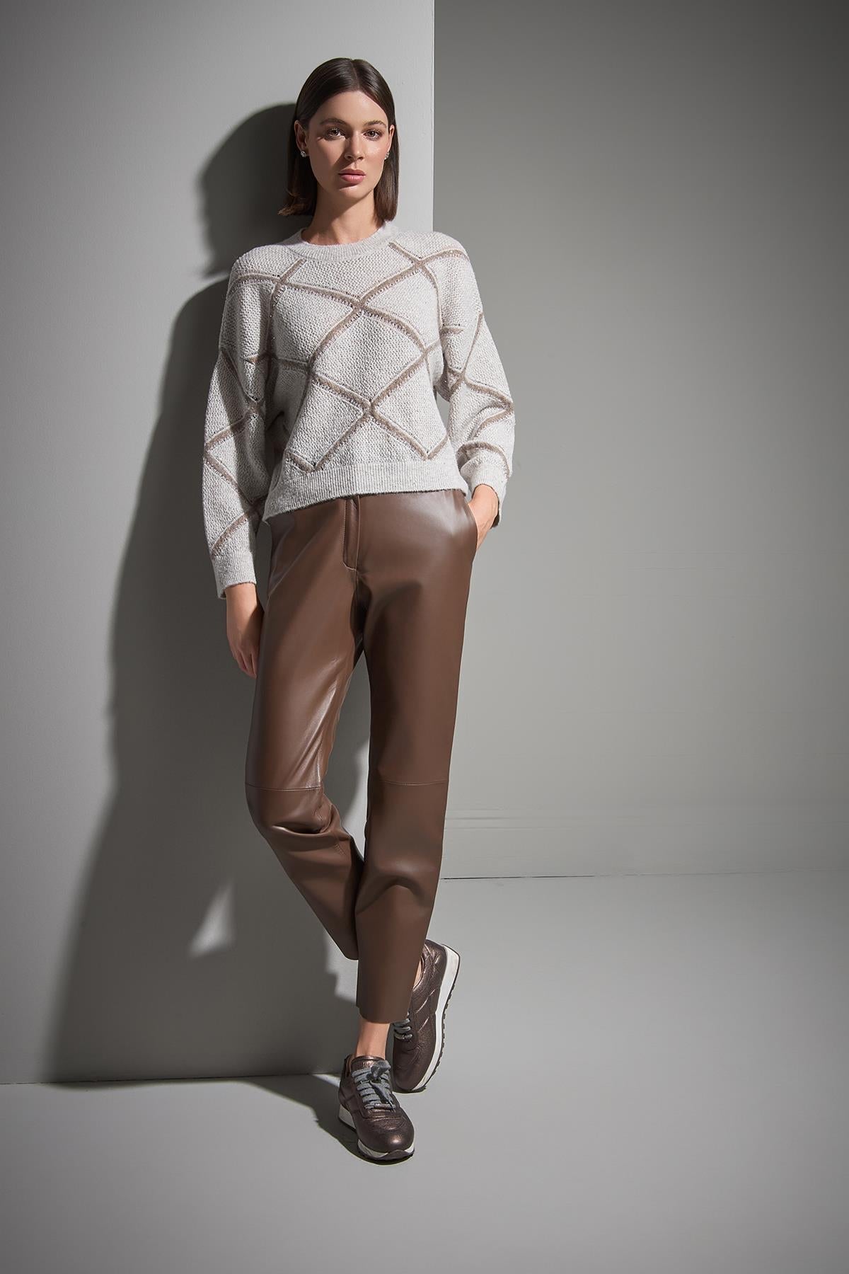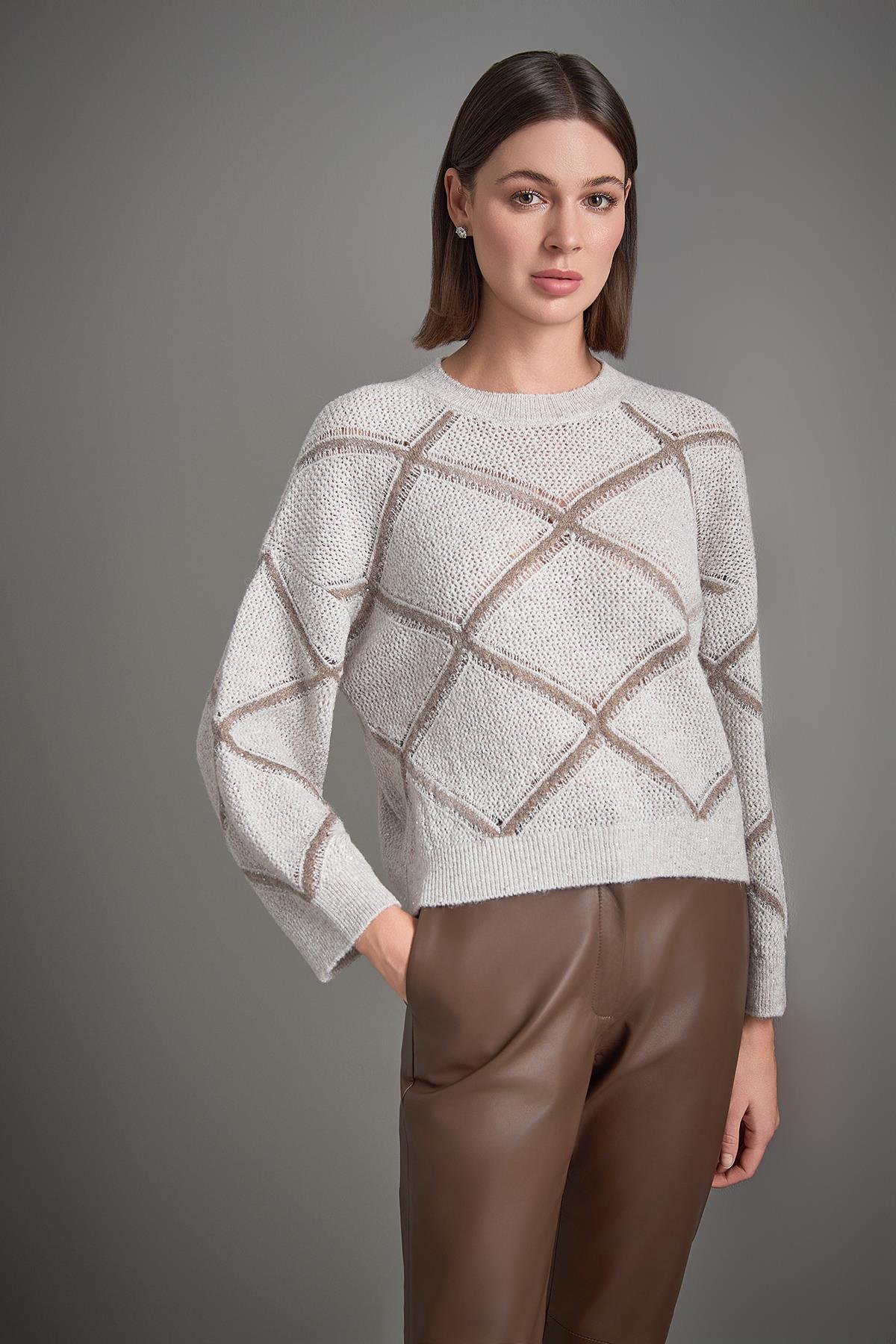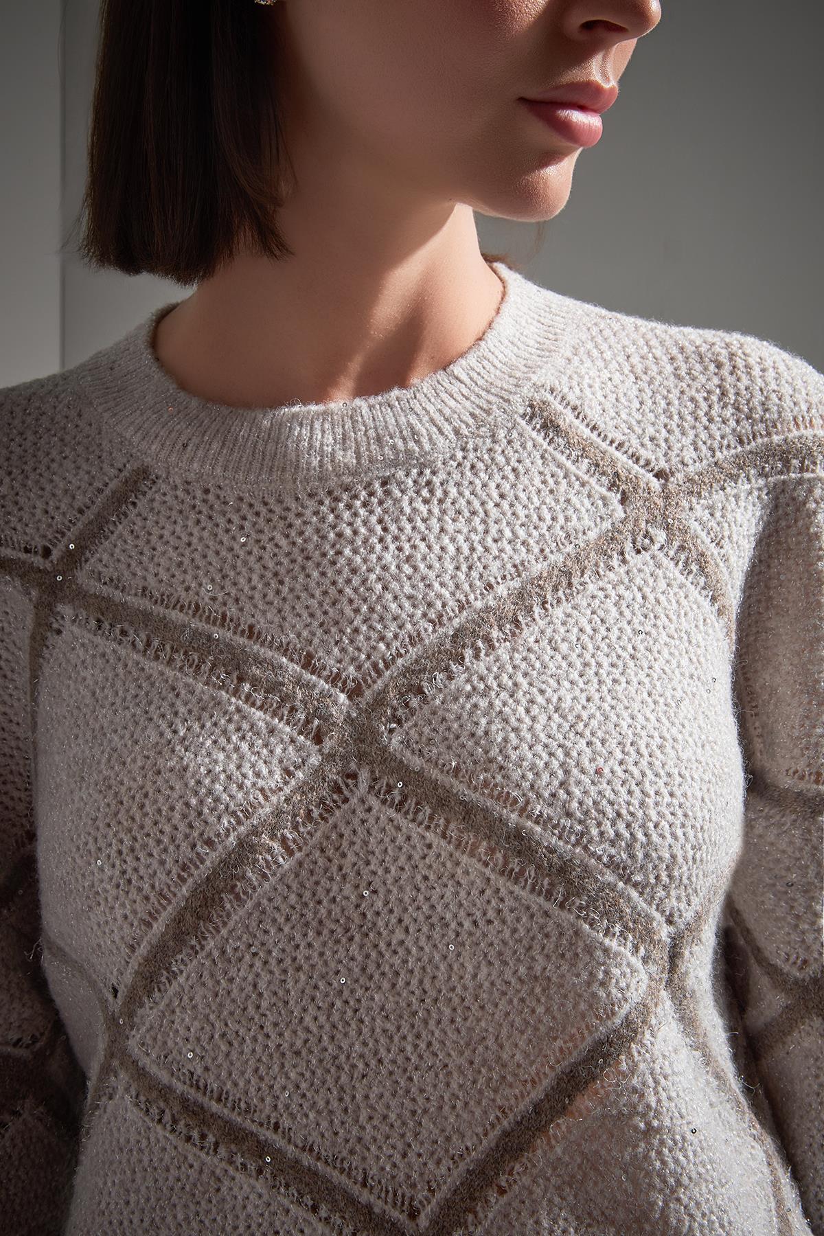 Pul ve Sim Detaylı Bisiklet Yaka Desenli Bej Triko Kazak