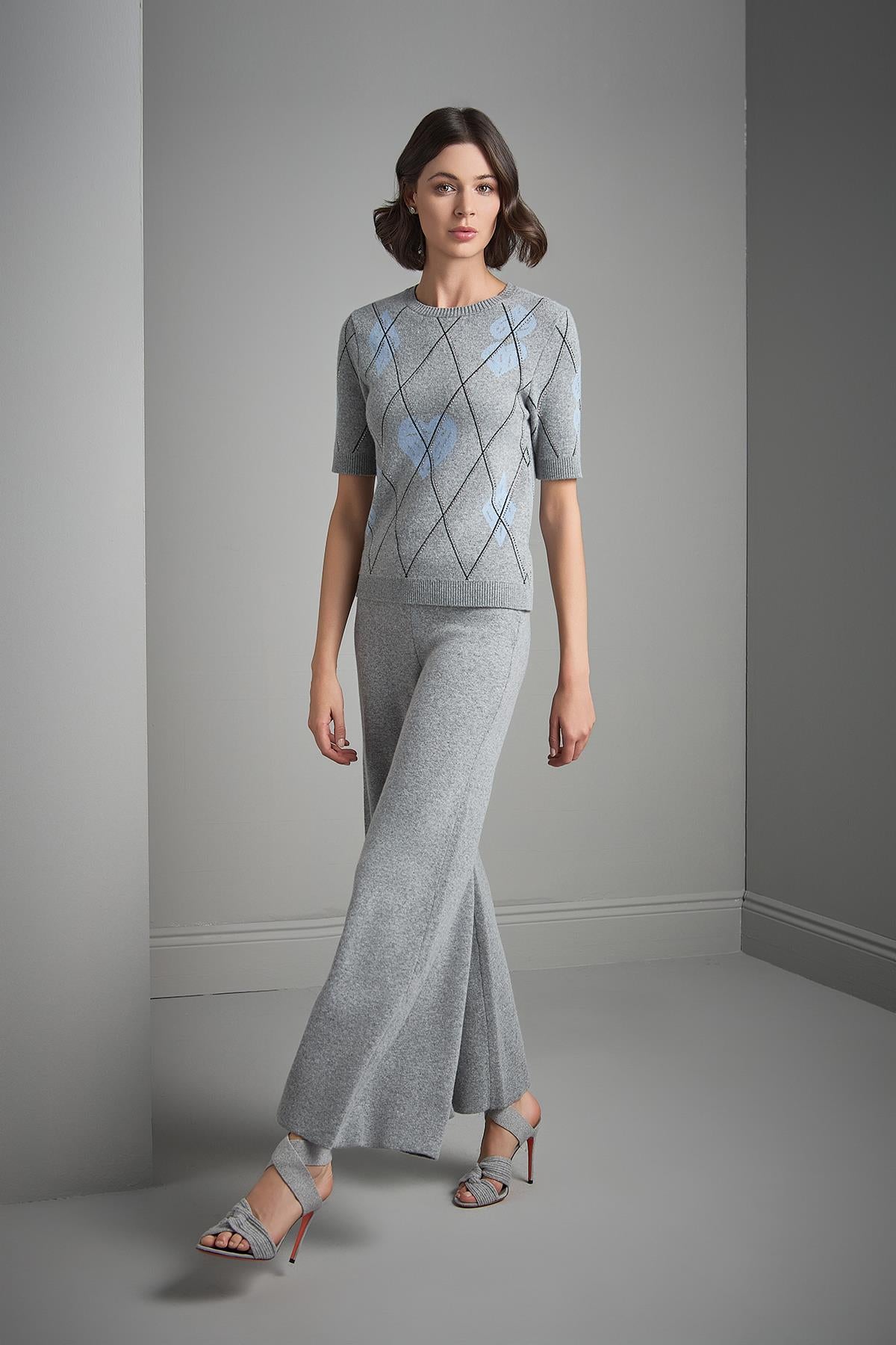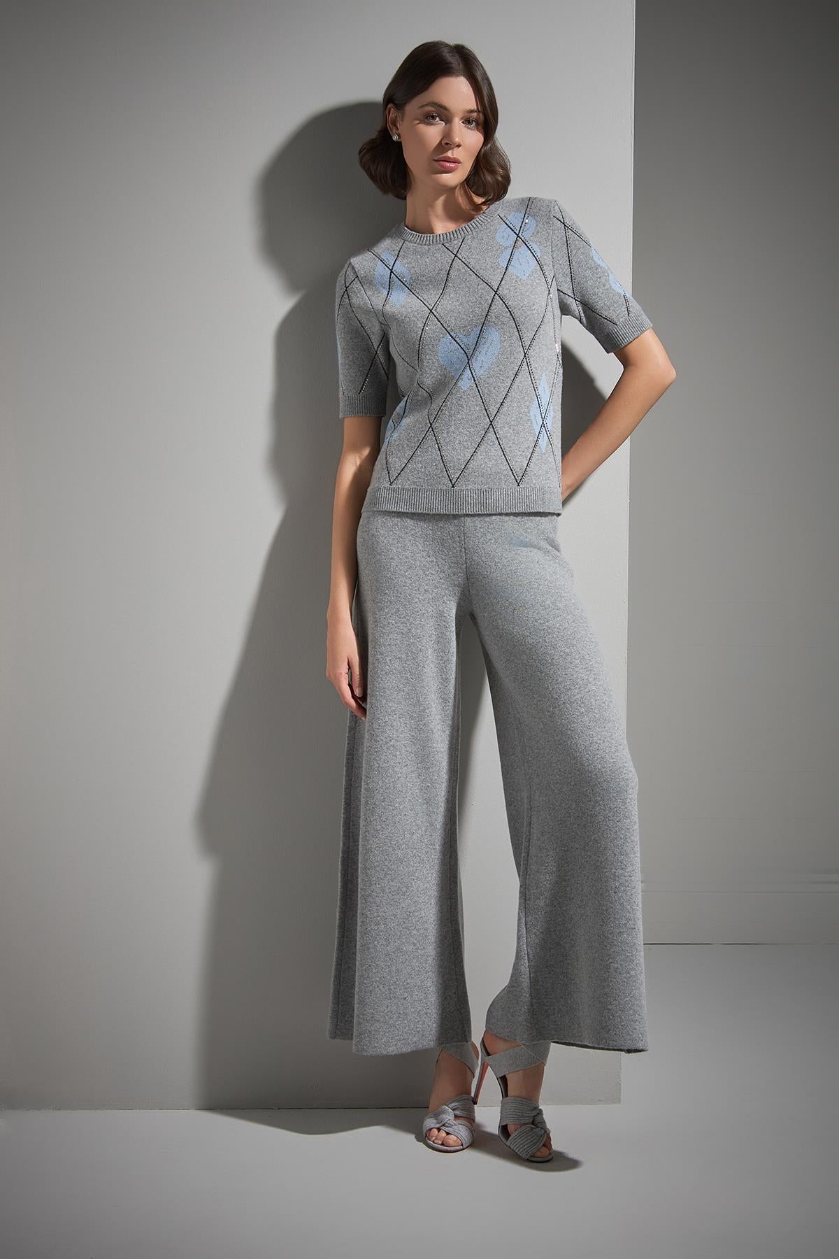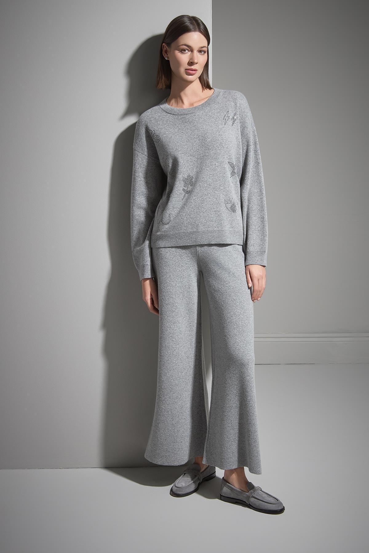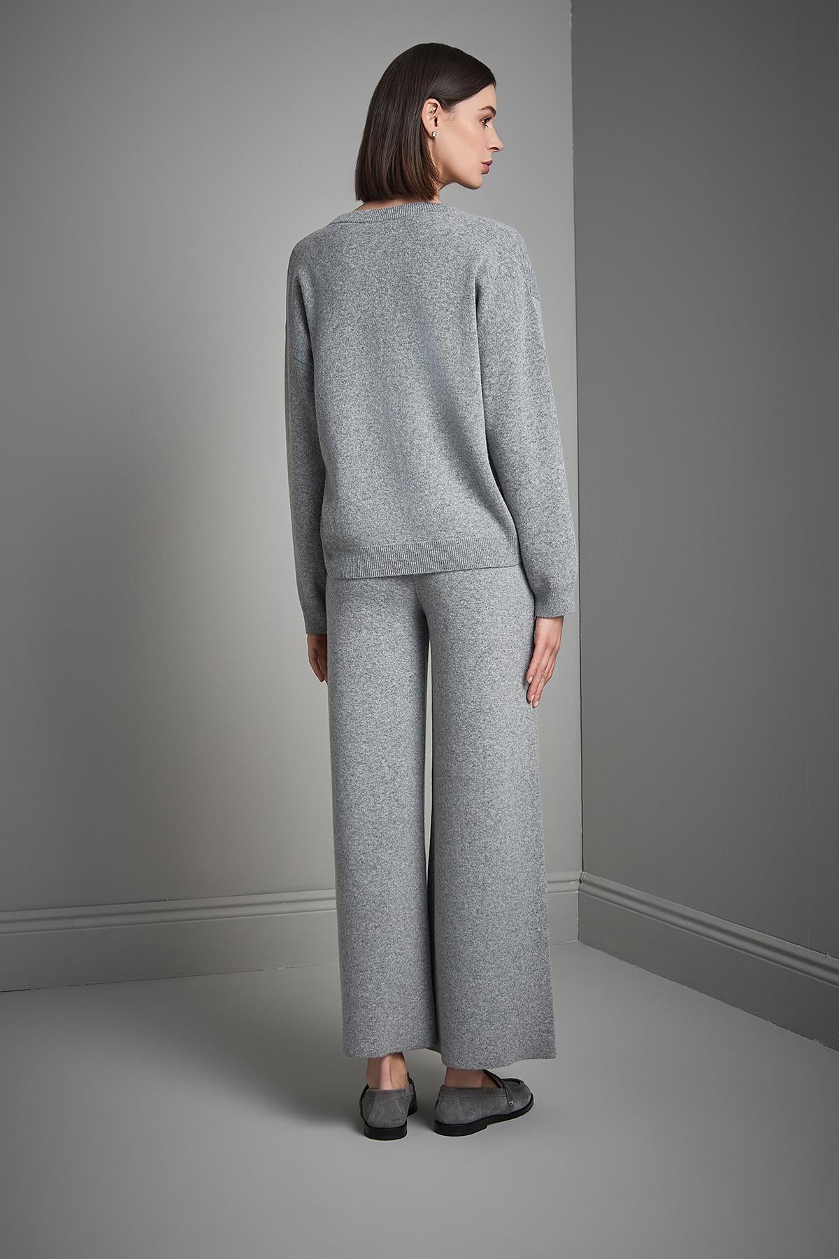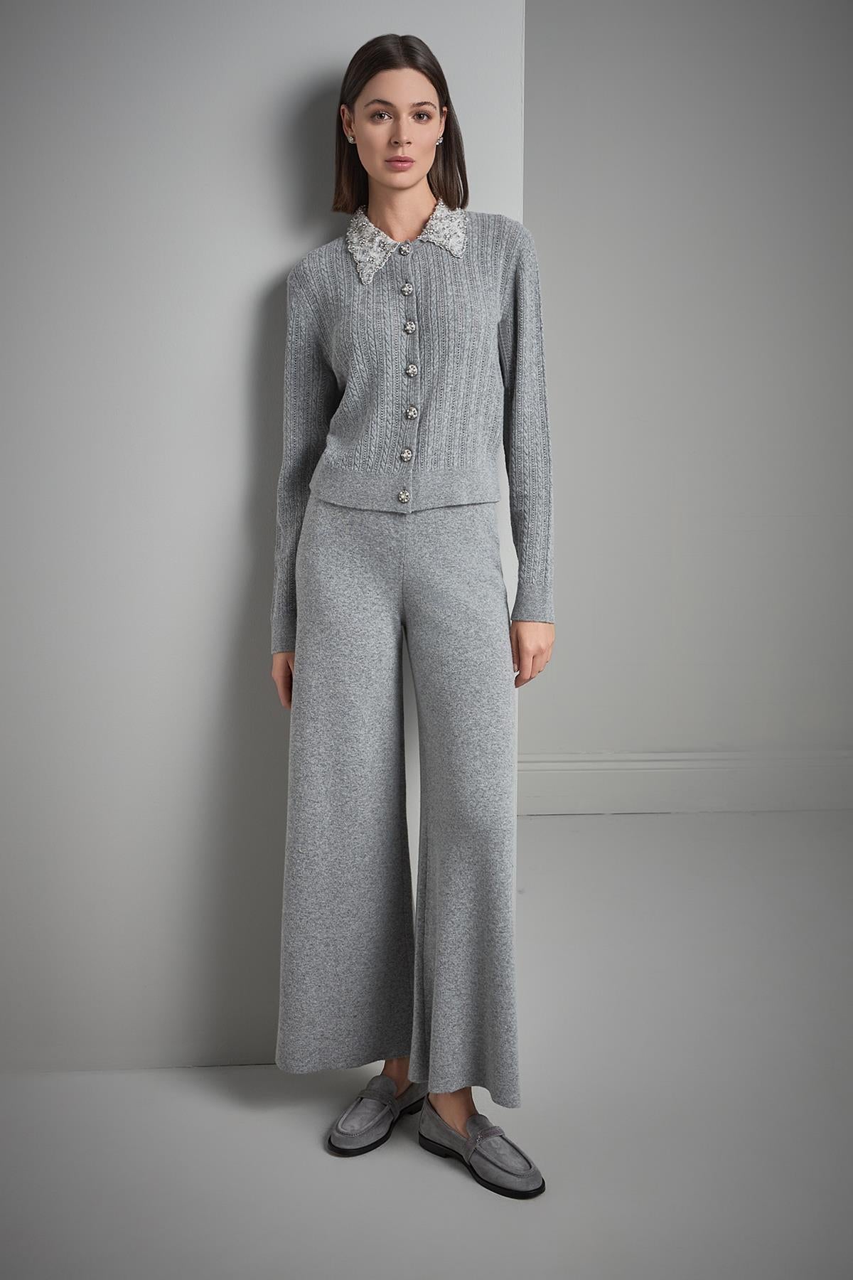 Beli Lastikli Bol Paça Gri Triko Pantolon