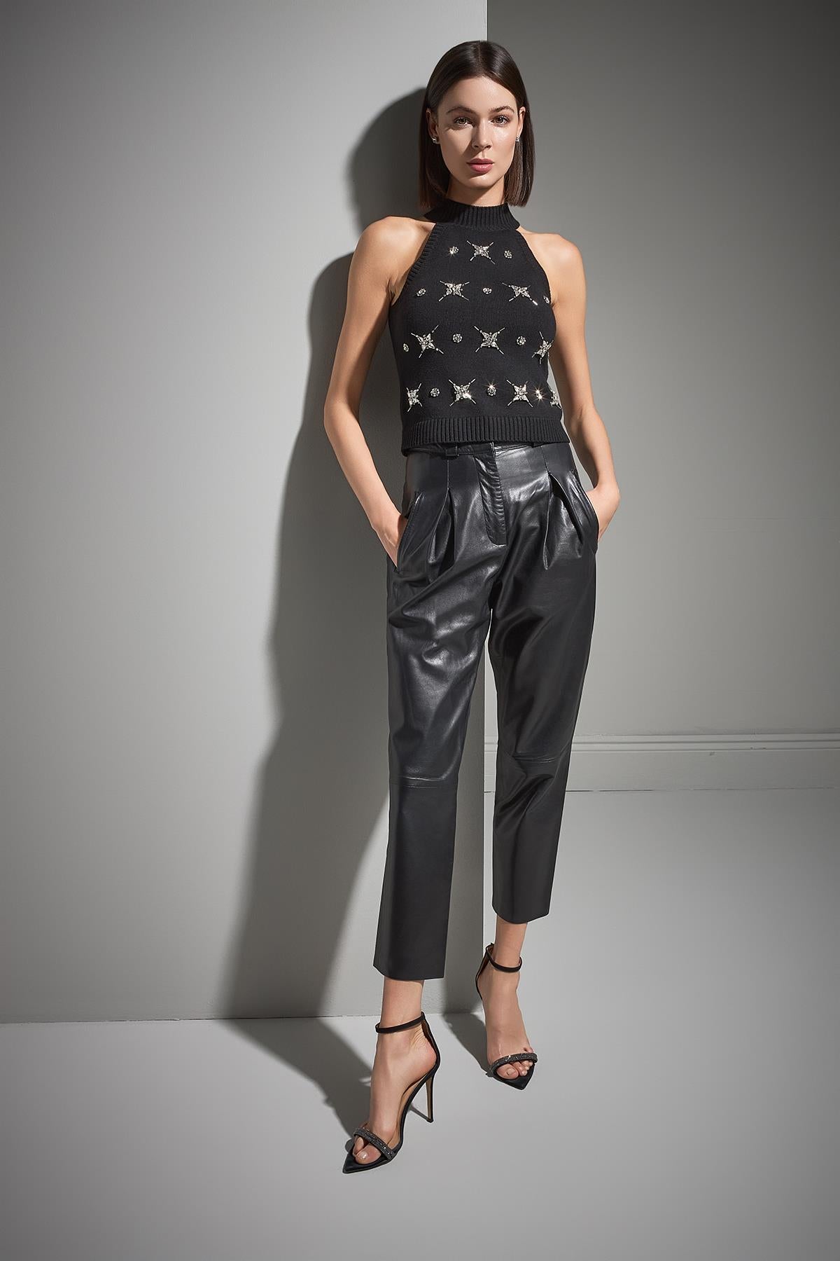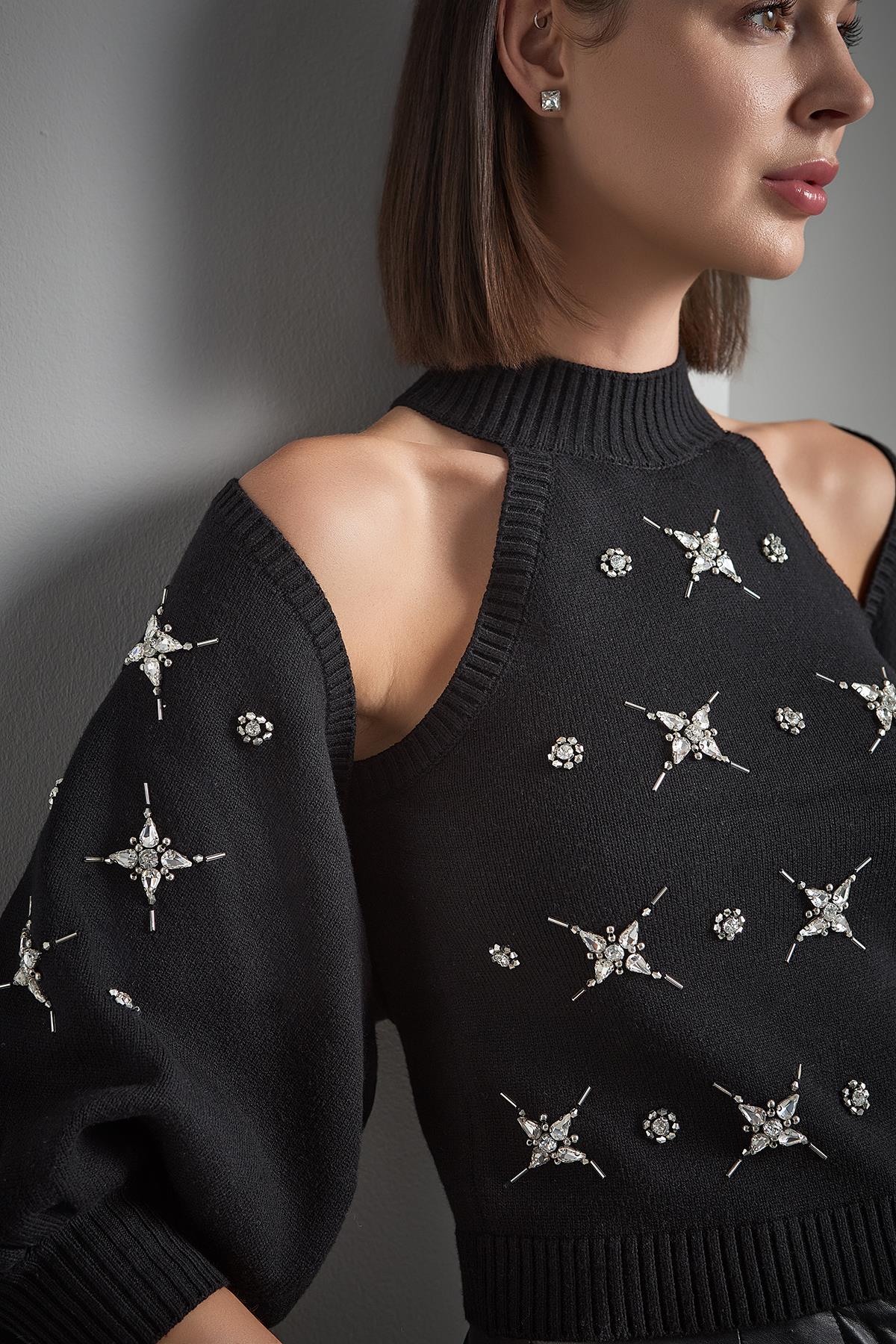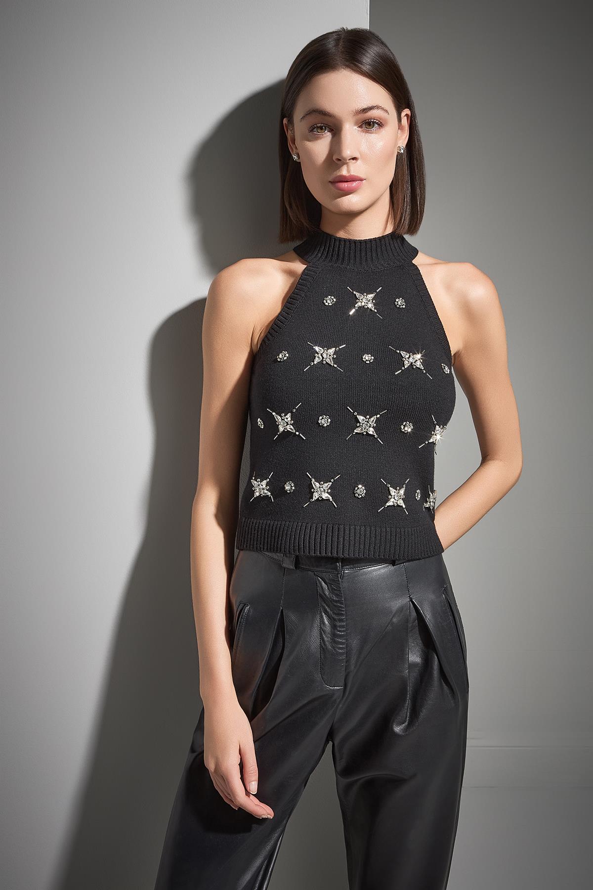 El İşi Taş İşlemeli Halter Yaka Siyah Triko Bluz