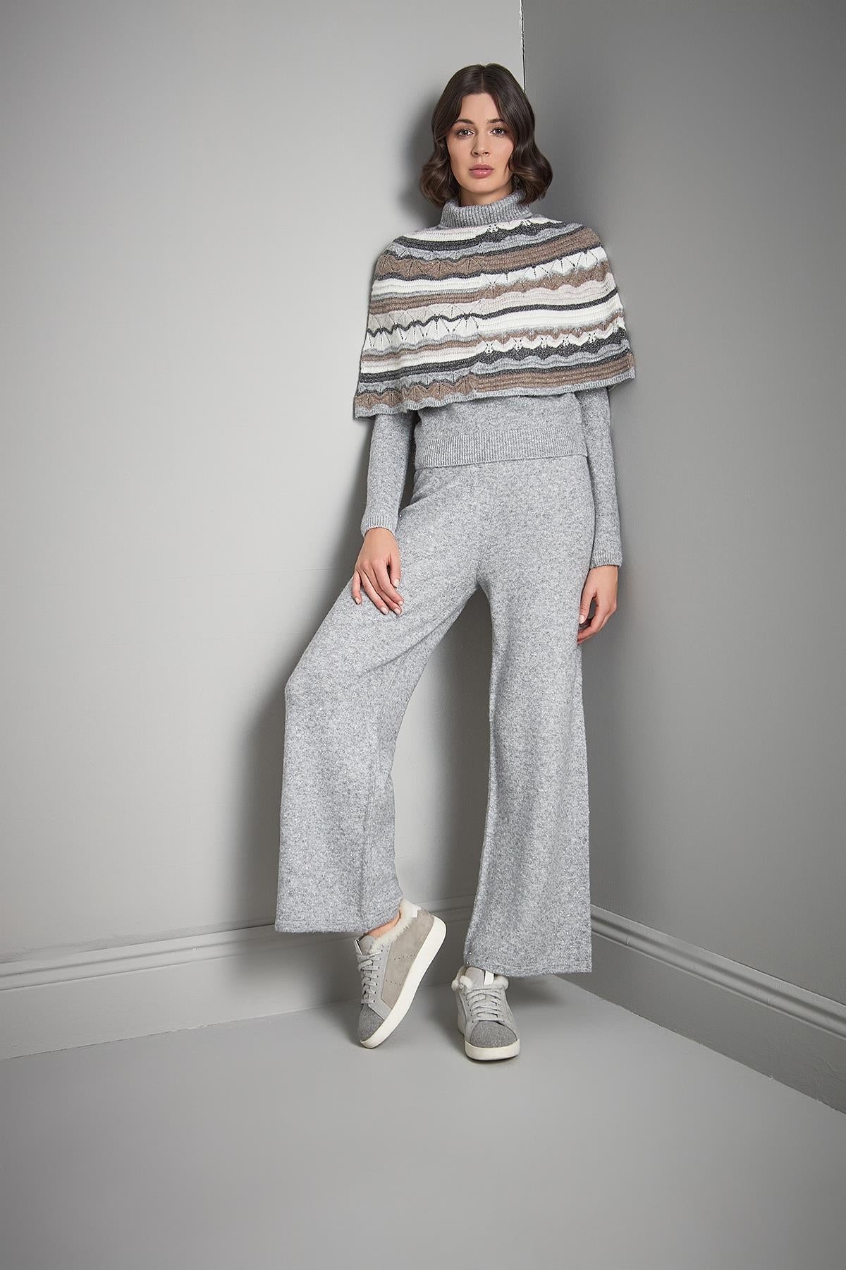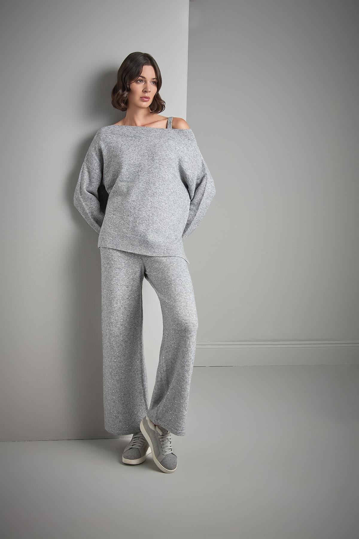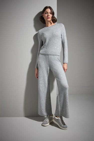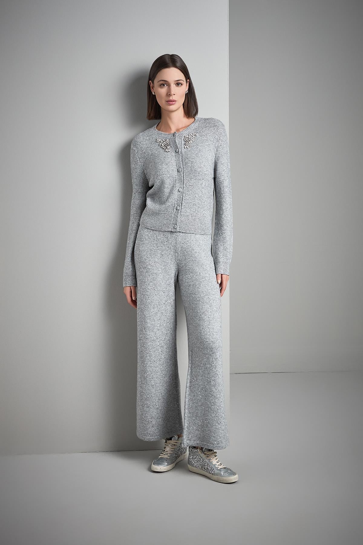 Pul ve Sim Detaylı Bol Paça Gri Triko Pantolon
