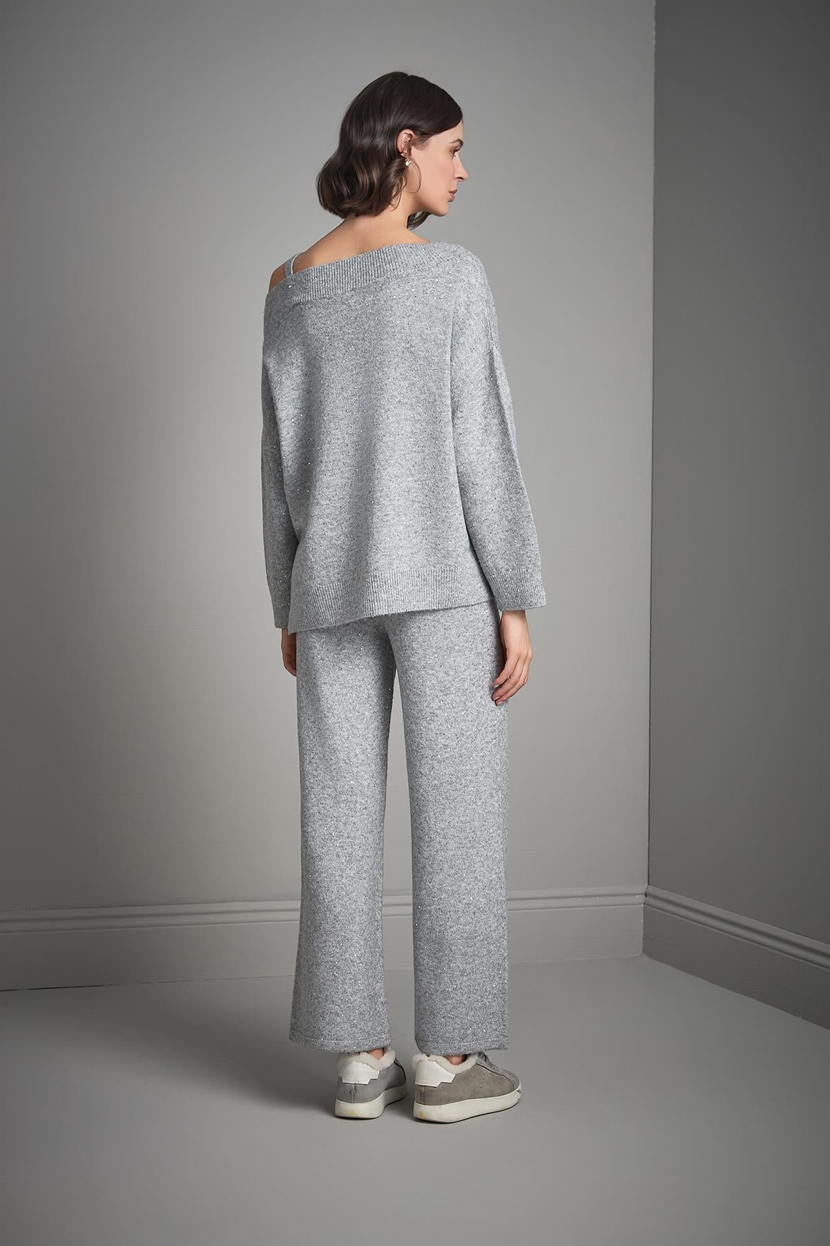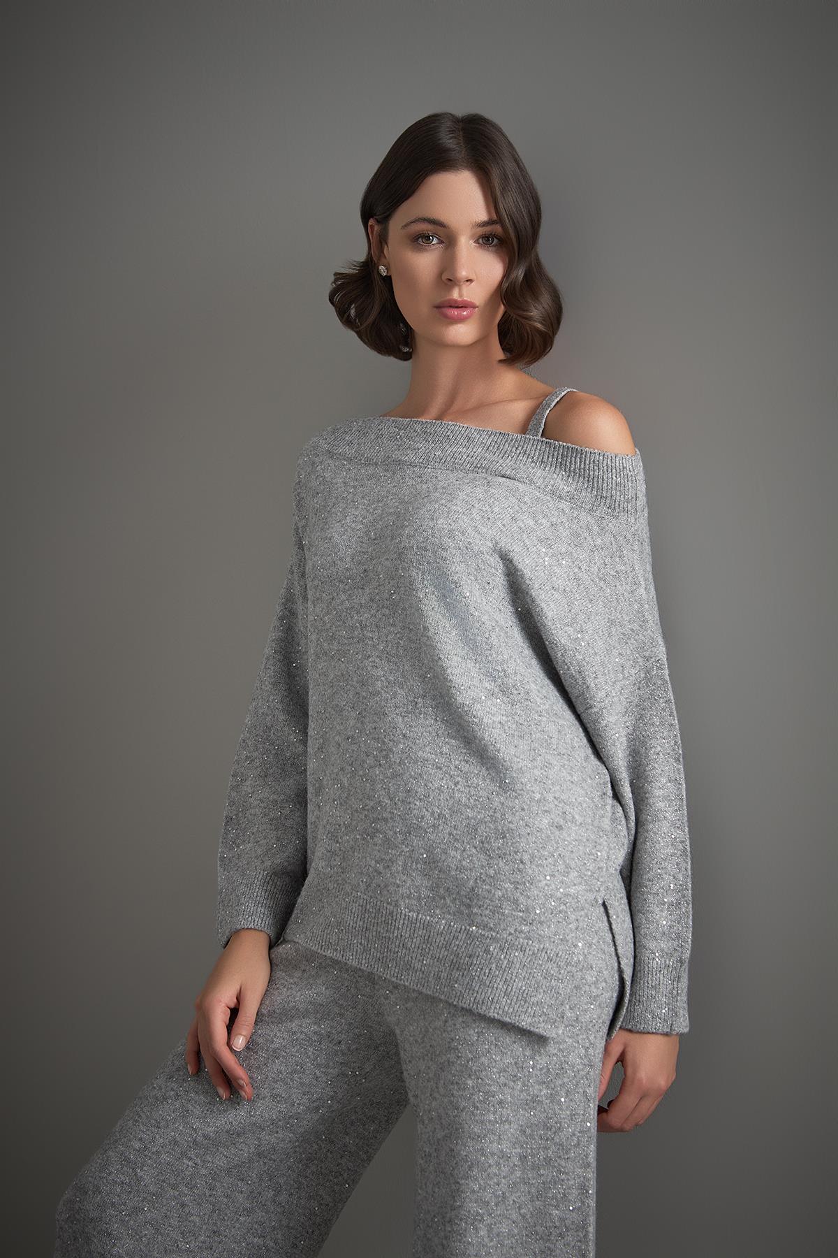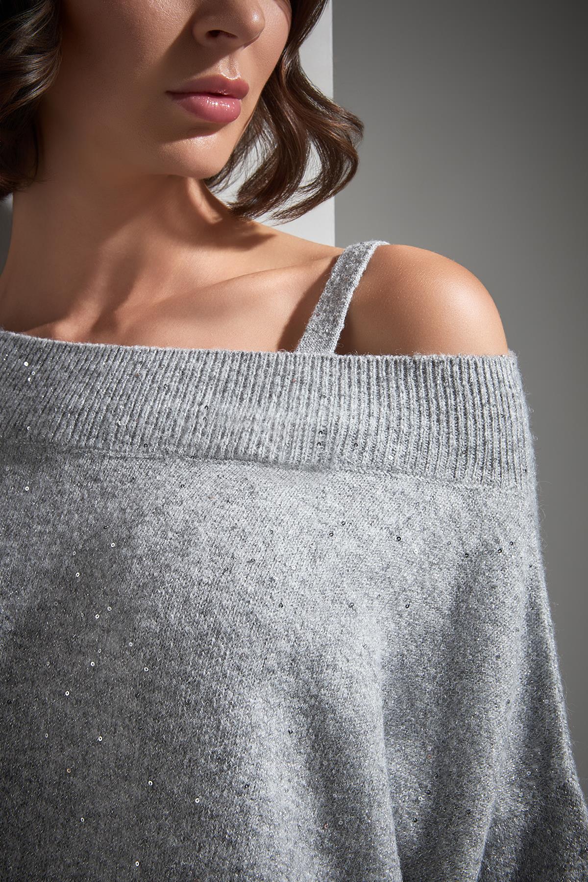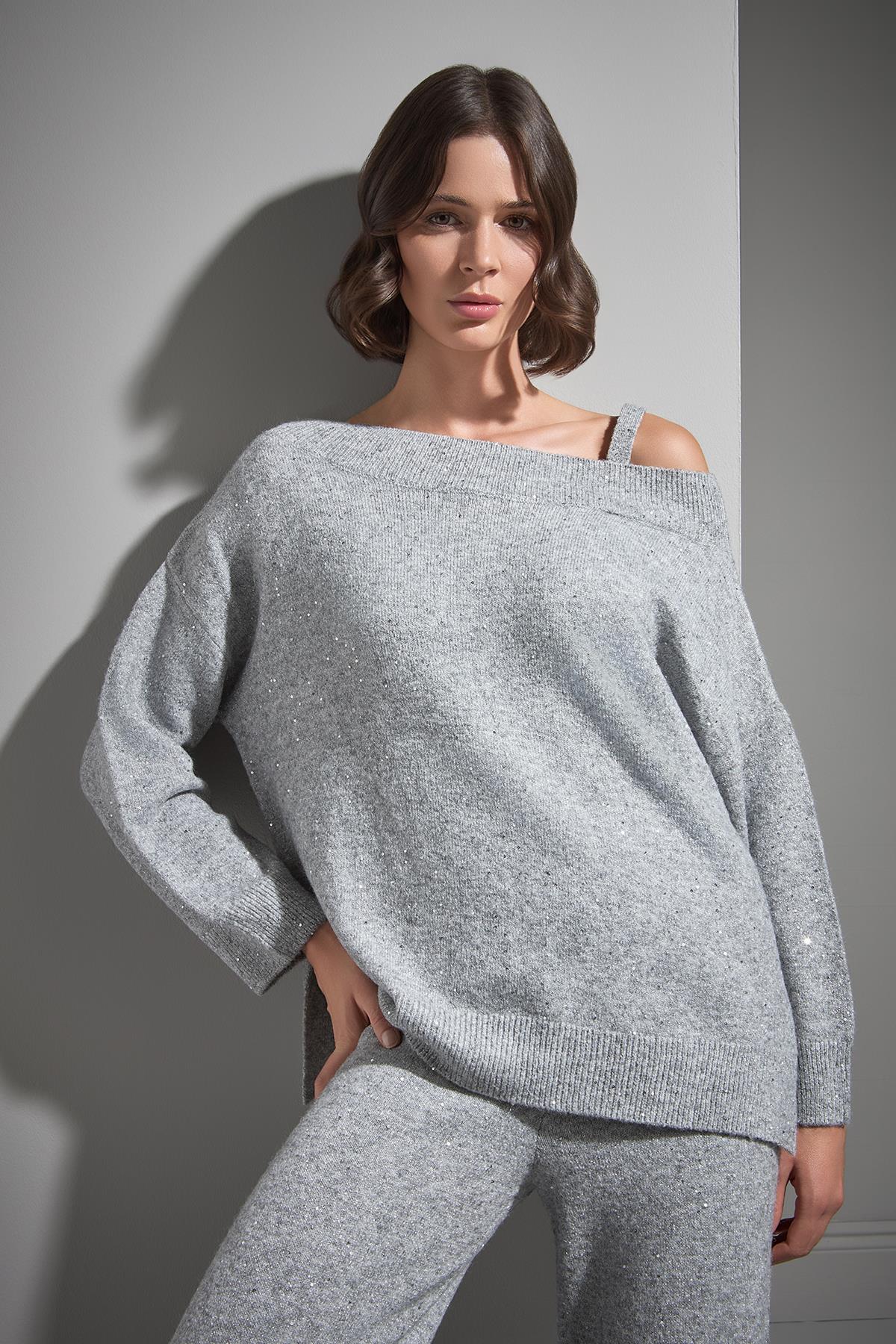 Pul ve Sim Detaylı Kayık Yaka Gri Triko Kazak