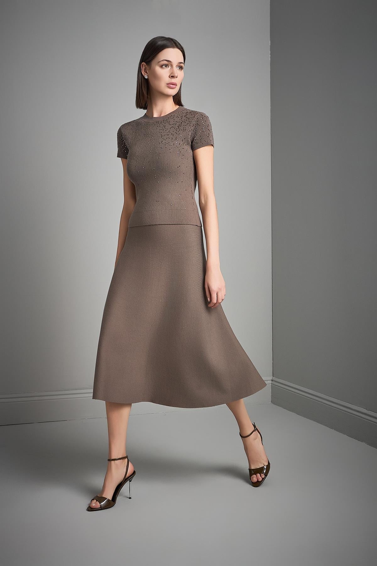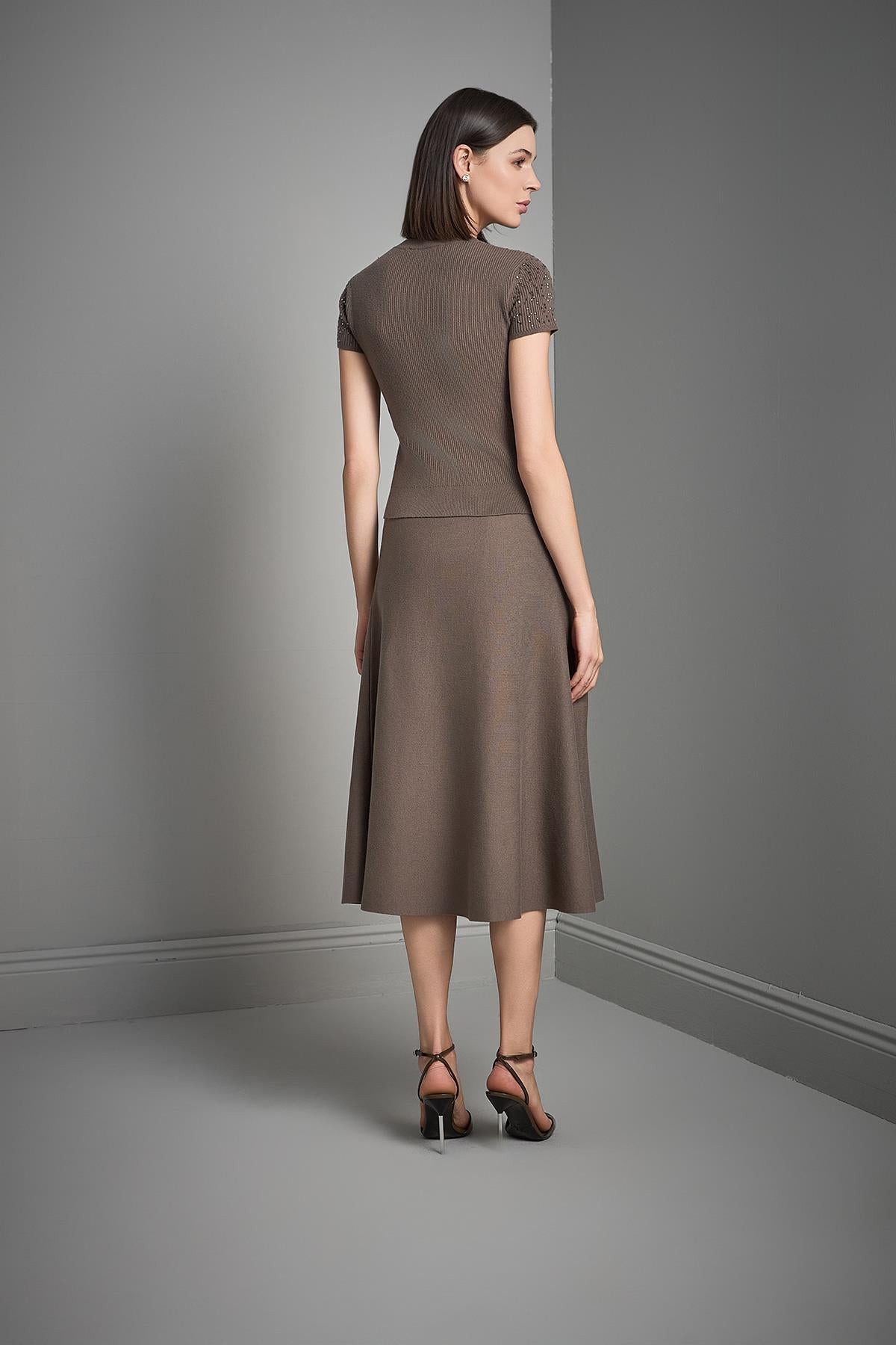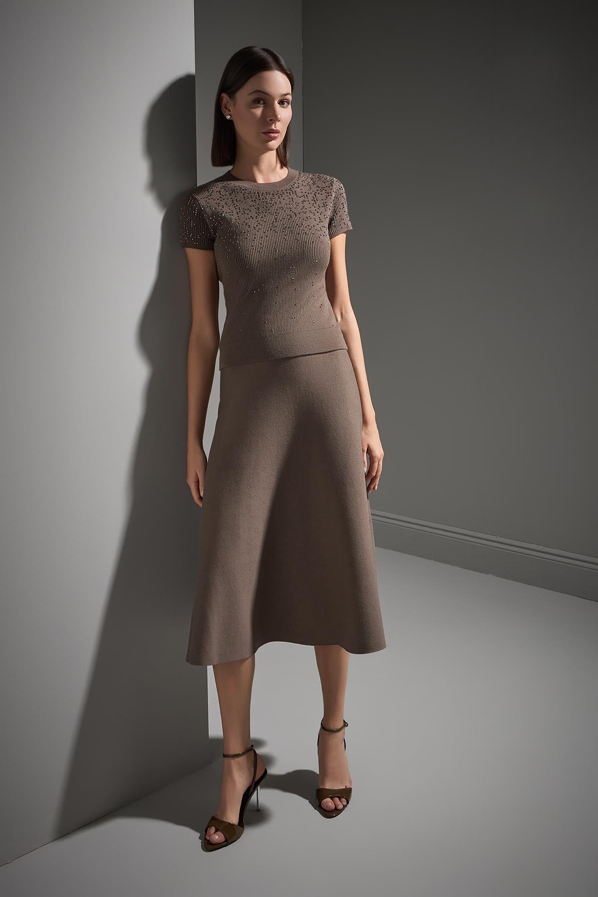 Taş Baskılı Kısa Kollu Kahverengi Triko Bluz