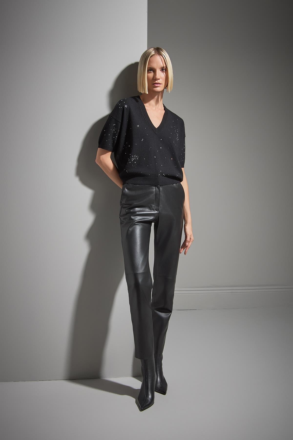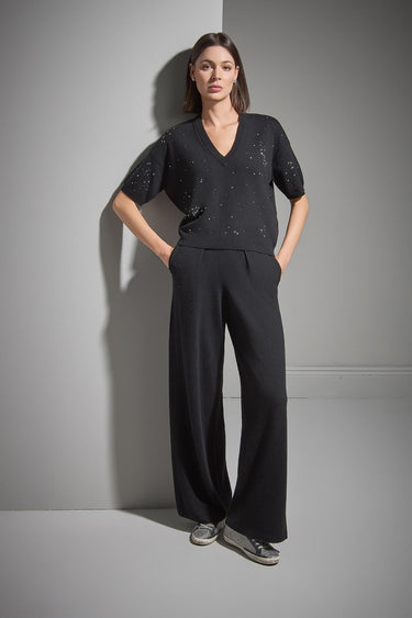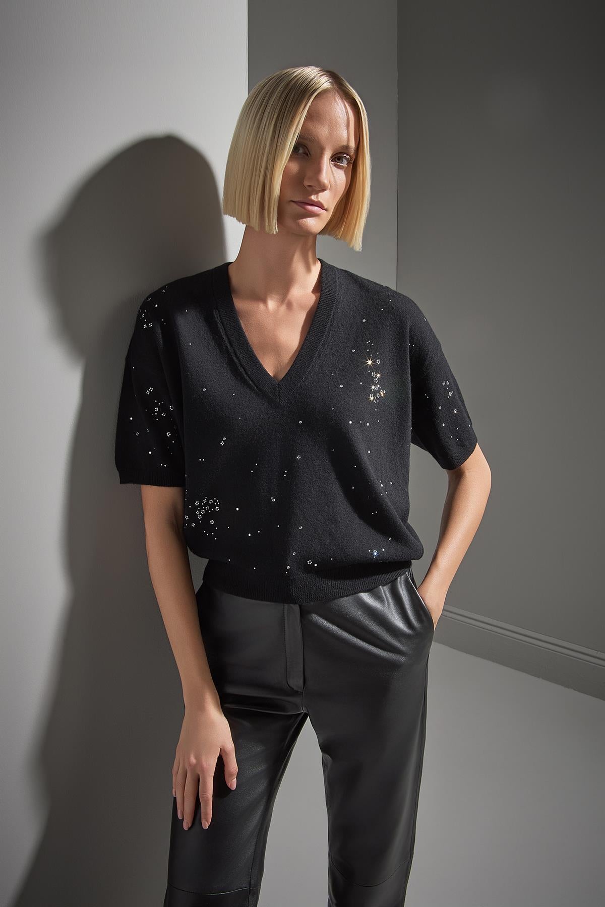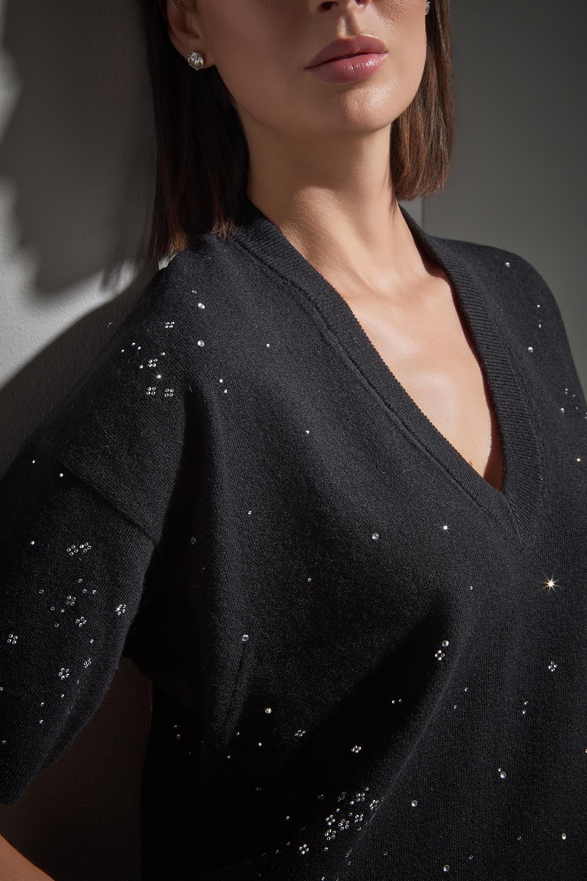 V Yaka Taş Baskılı Siyah Triko Kazak