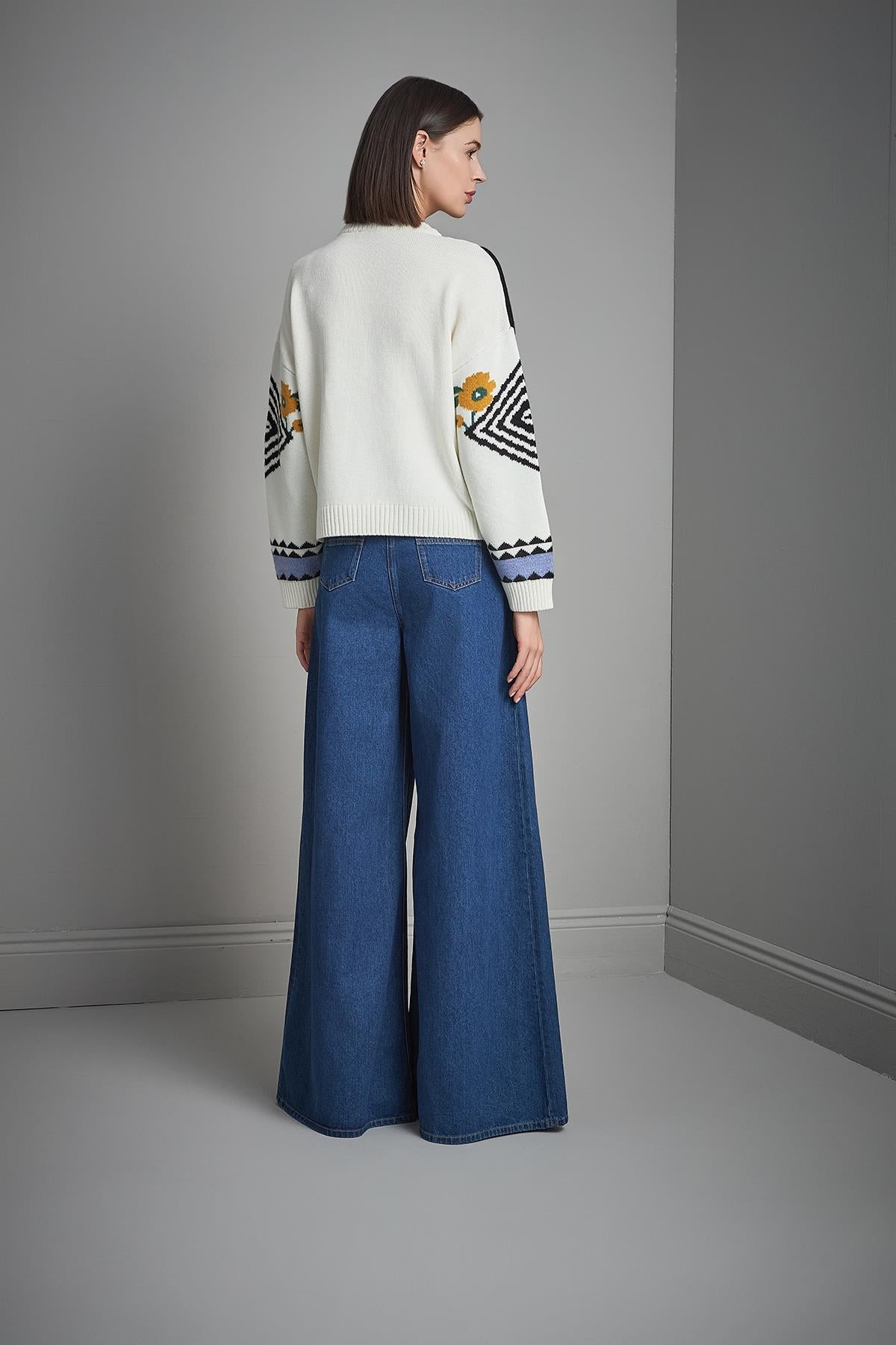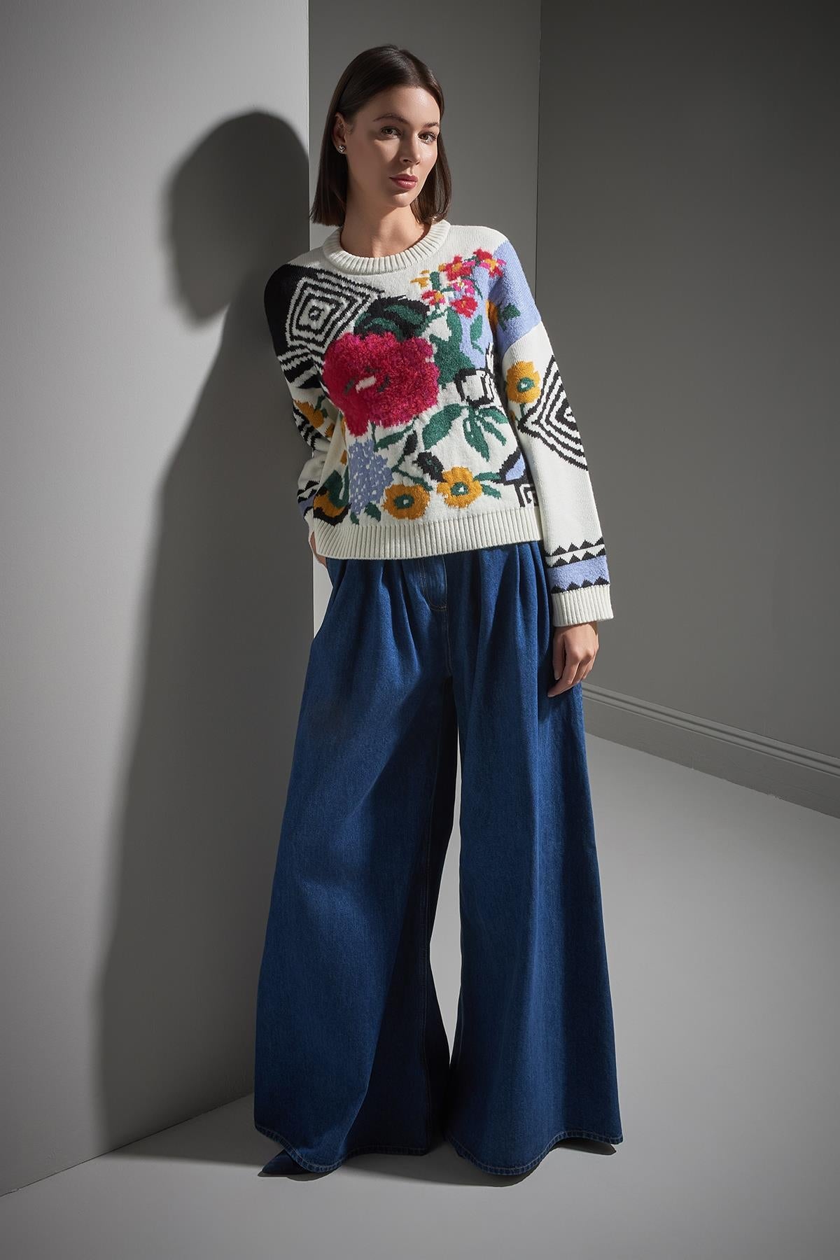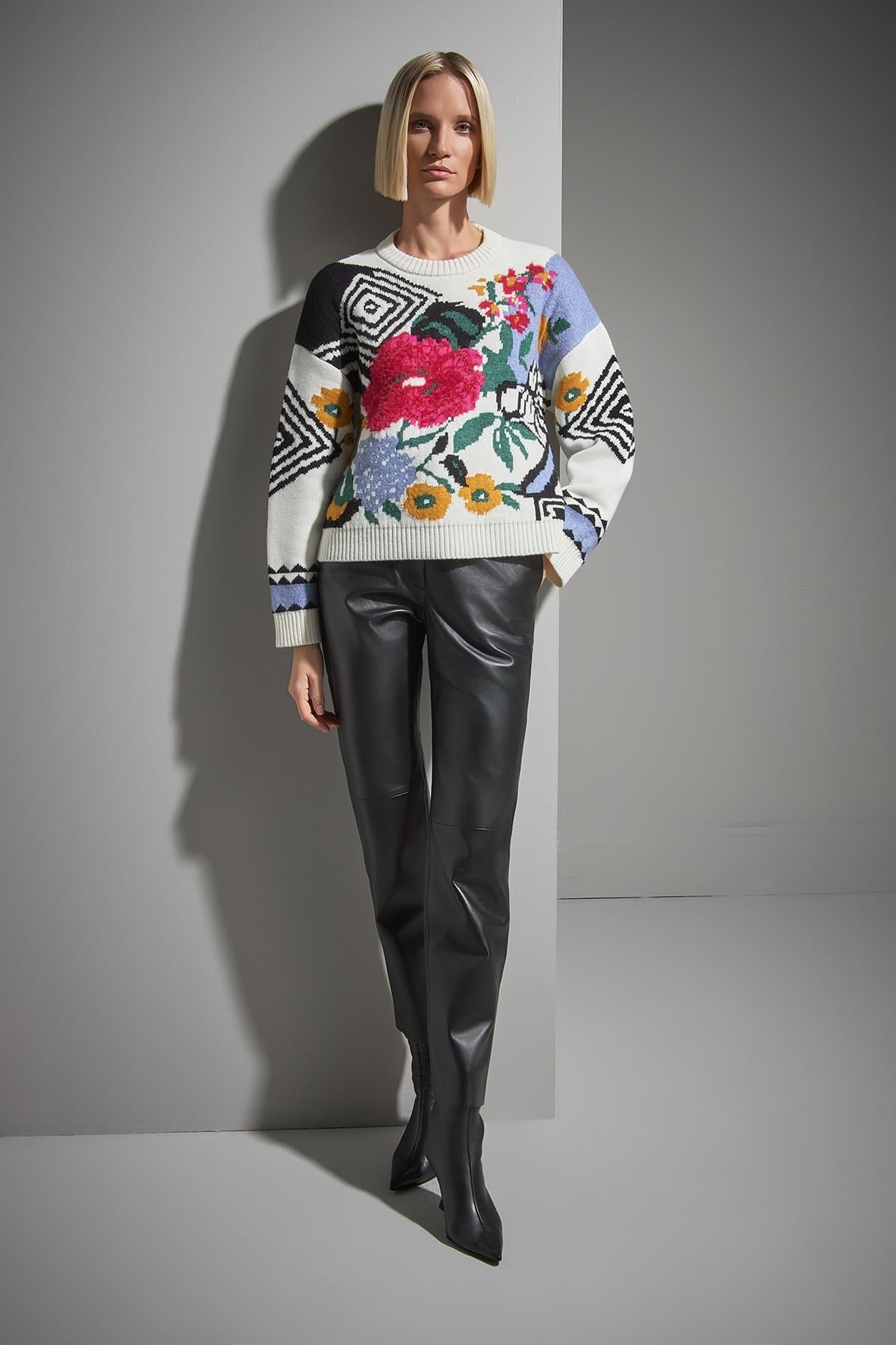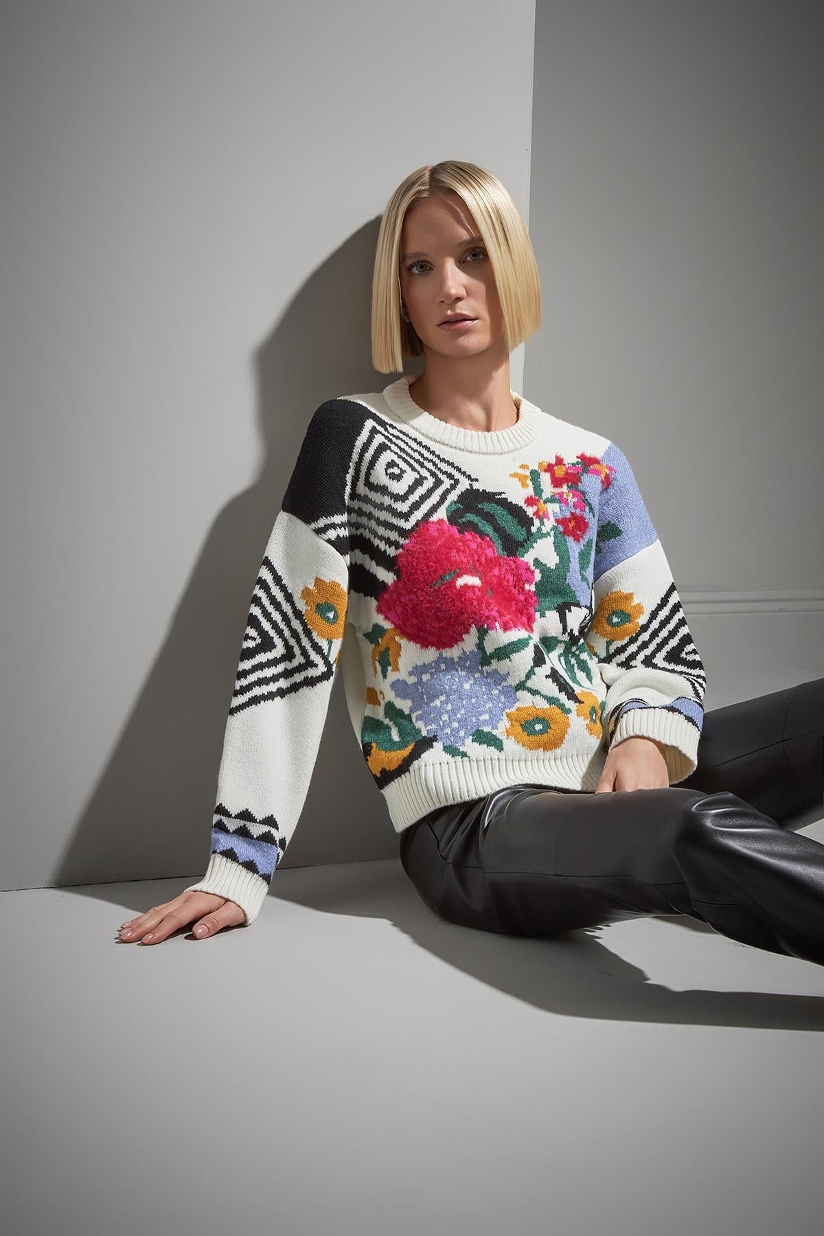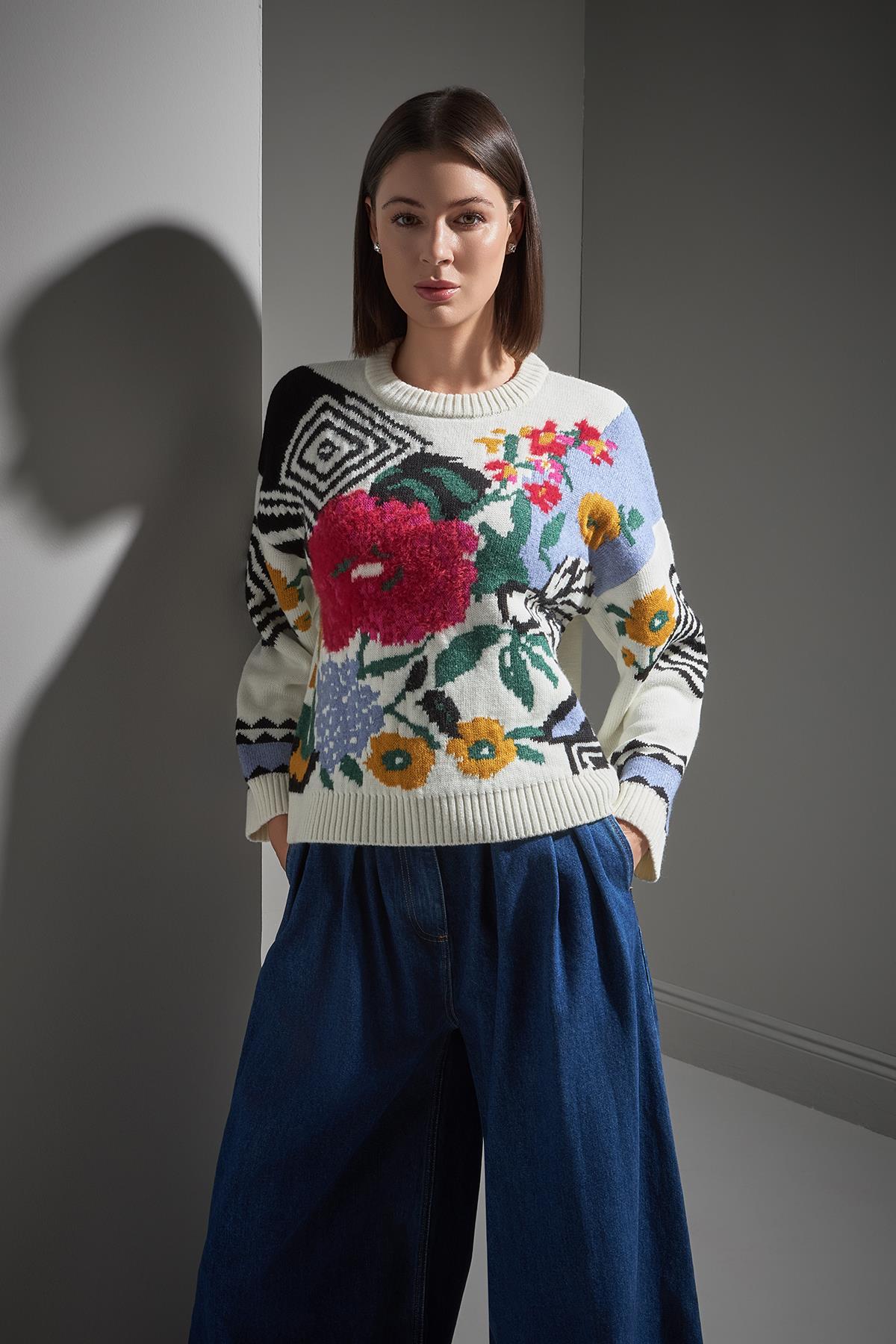 Bisiklet Yaka Çiçek Desenli Multi Triko Kazak