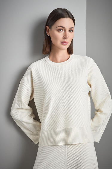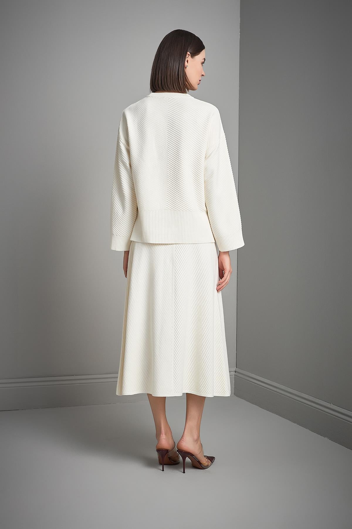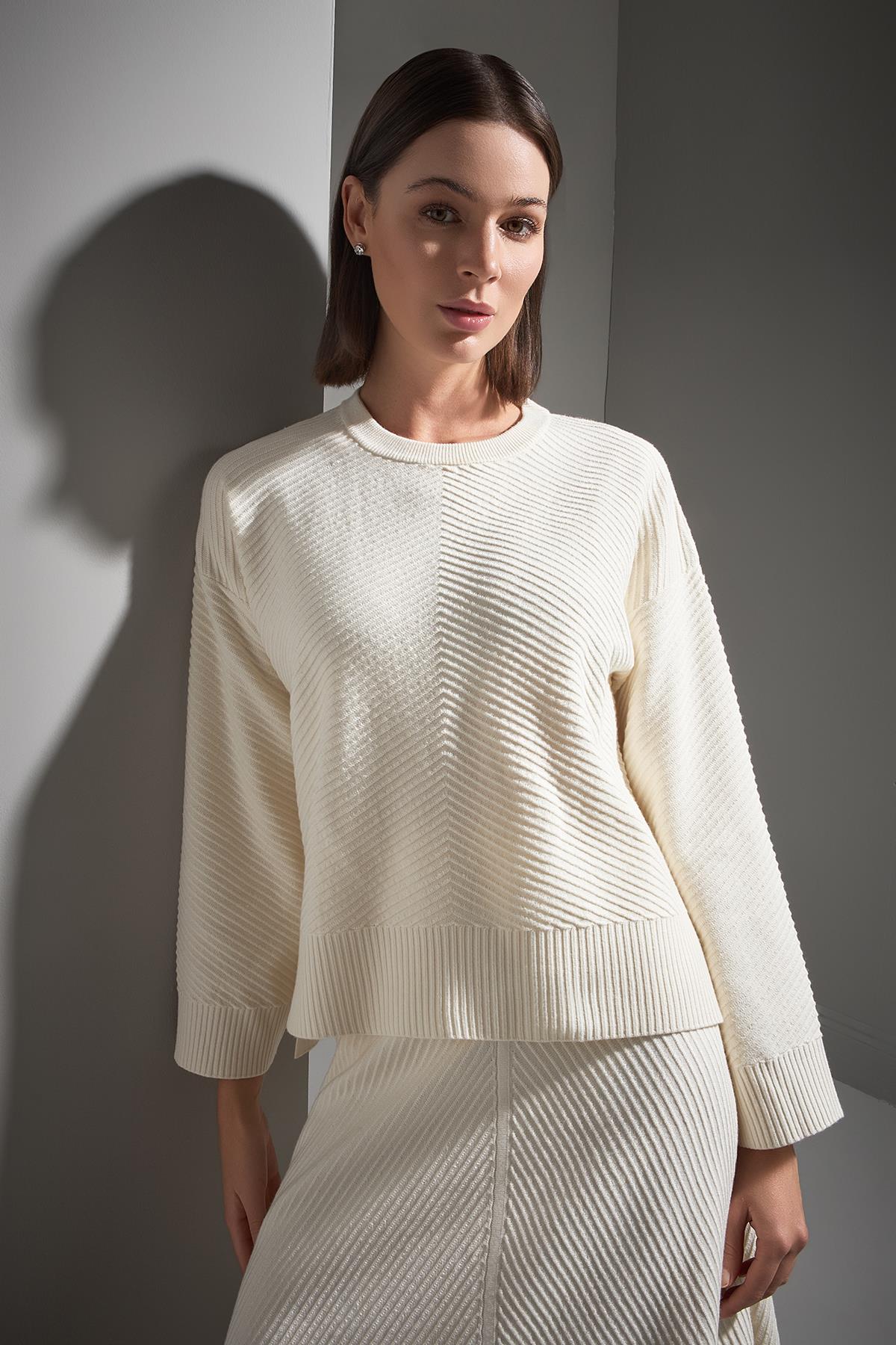 Bisiklet Yaka Verev Desenli Ekru Triko Kazak