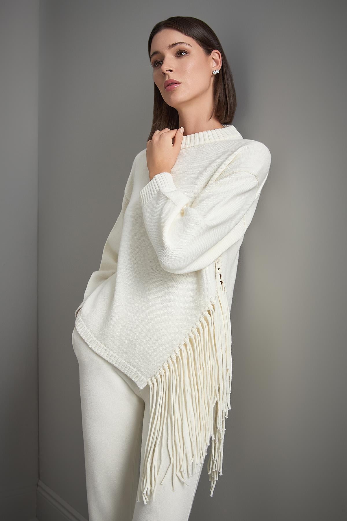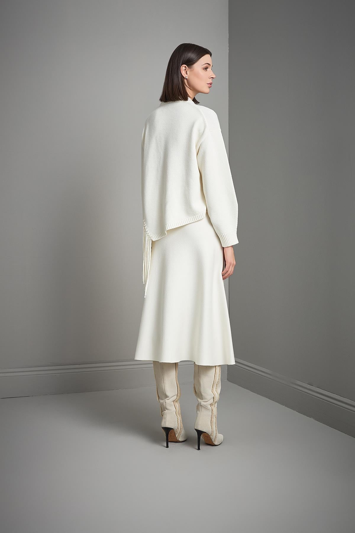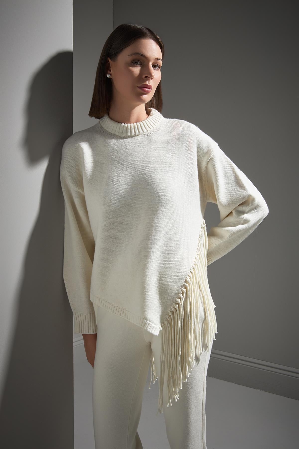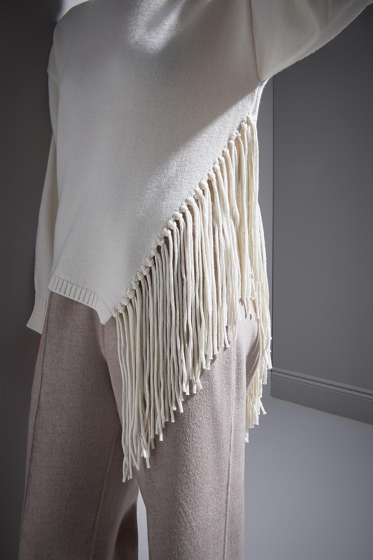 Püskül Detaylı Ekru Triko Kazak