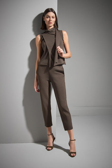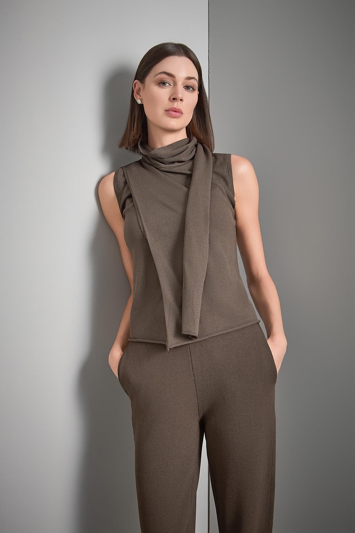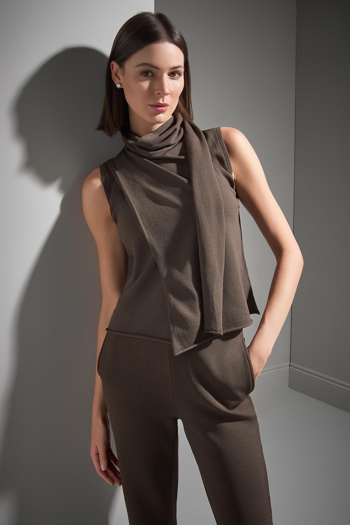 Şal Yaka Kolsuz Kahverengi Triko Bluz