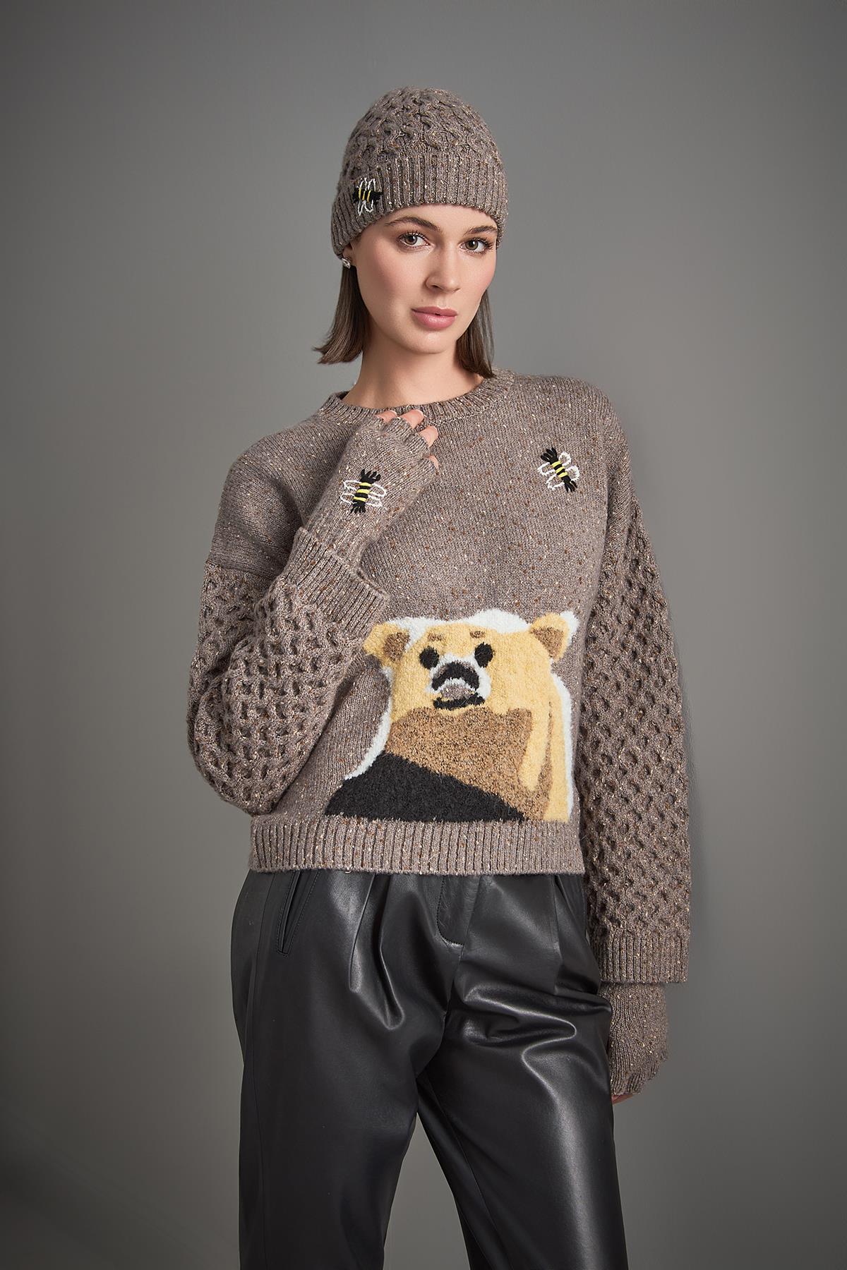 El İşleme Arı Figürlü Gri Triko Eldiven