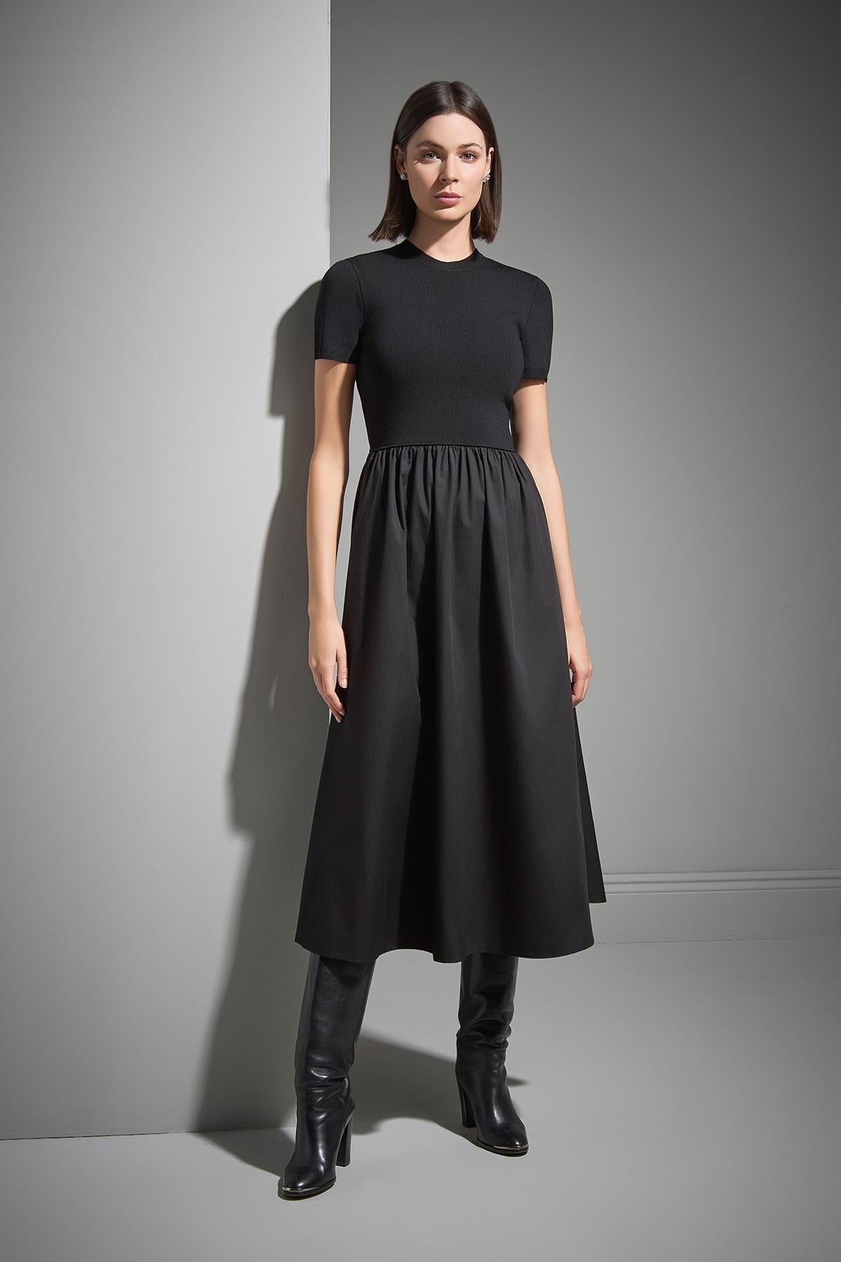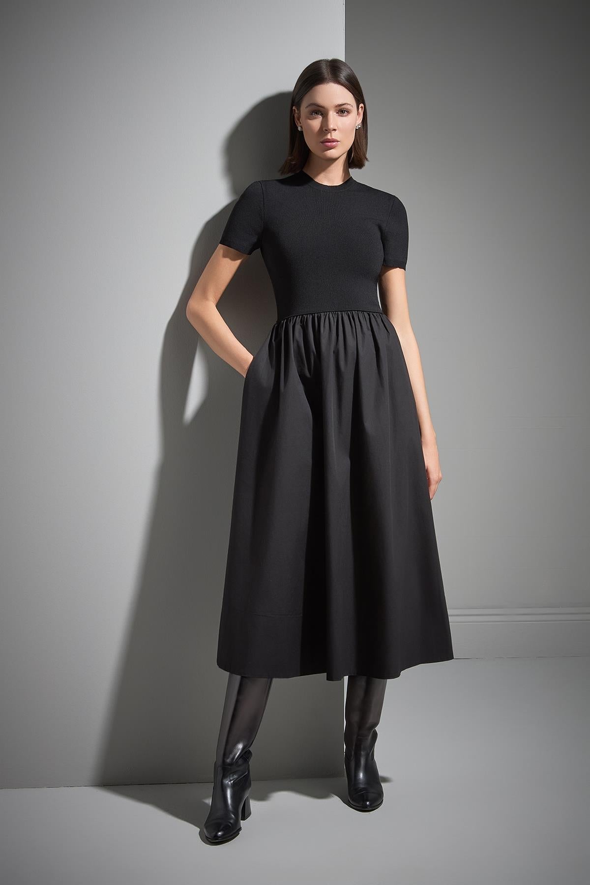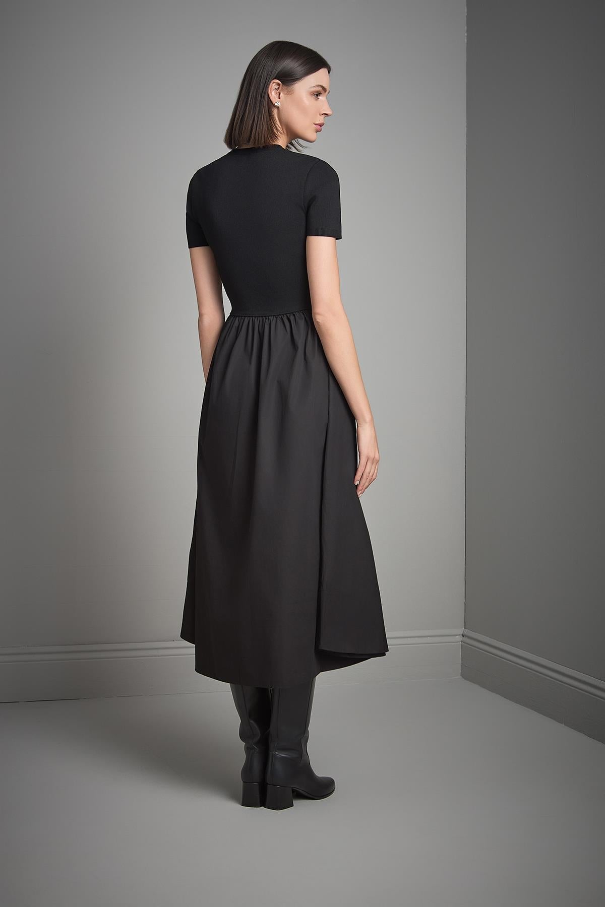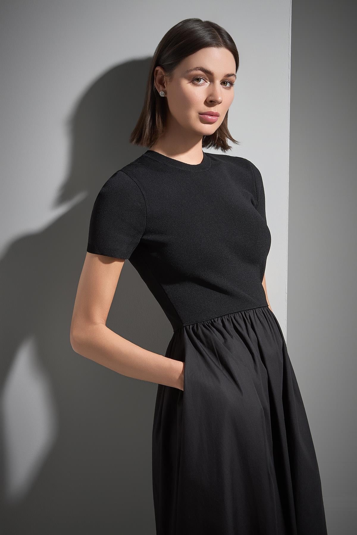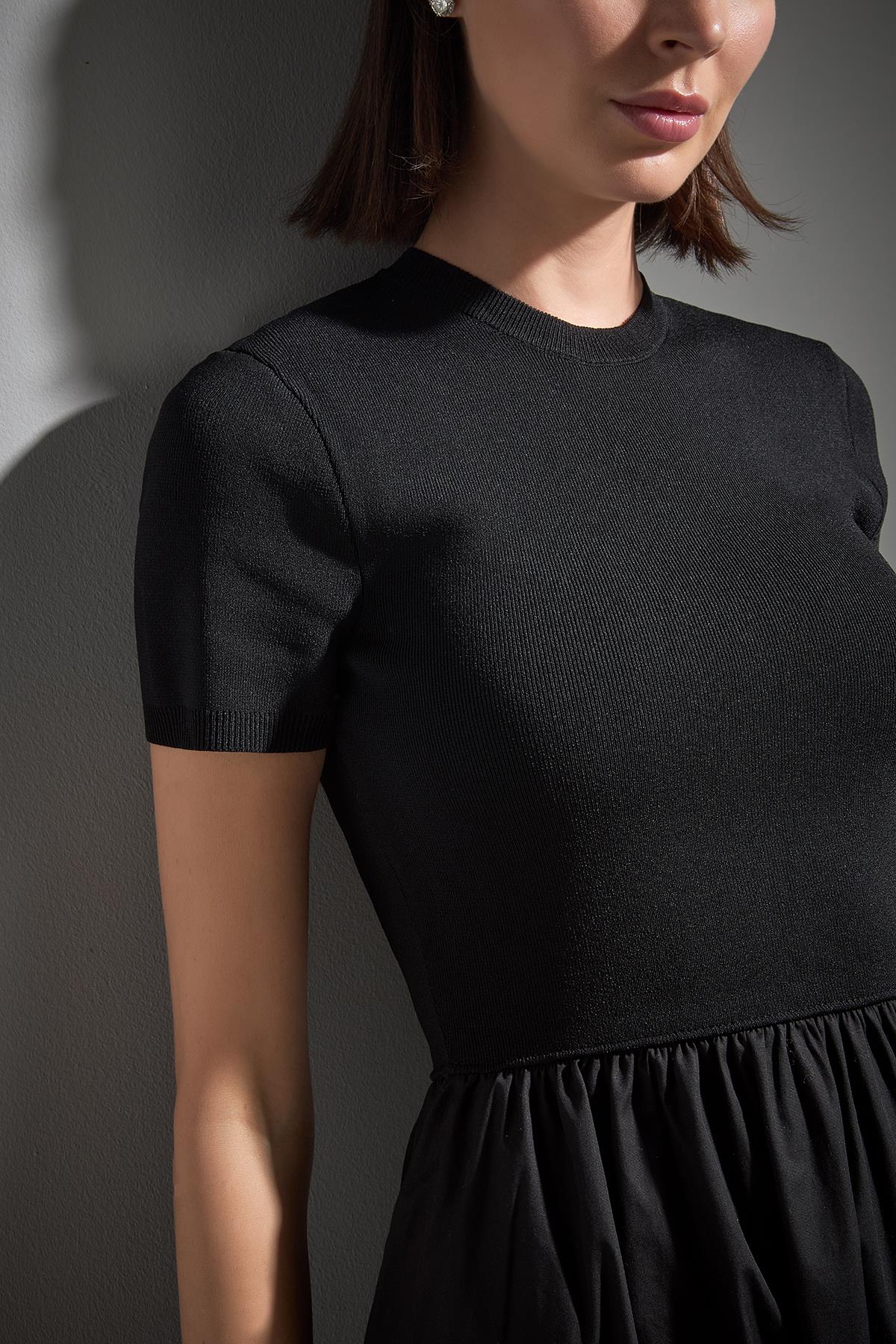 Kısa Kollu Kumaş Etekli Midi Siyah Triko Elbise