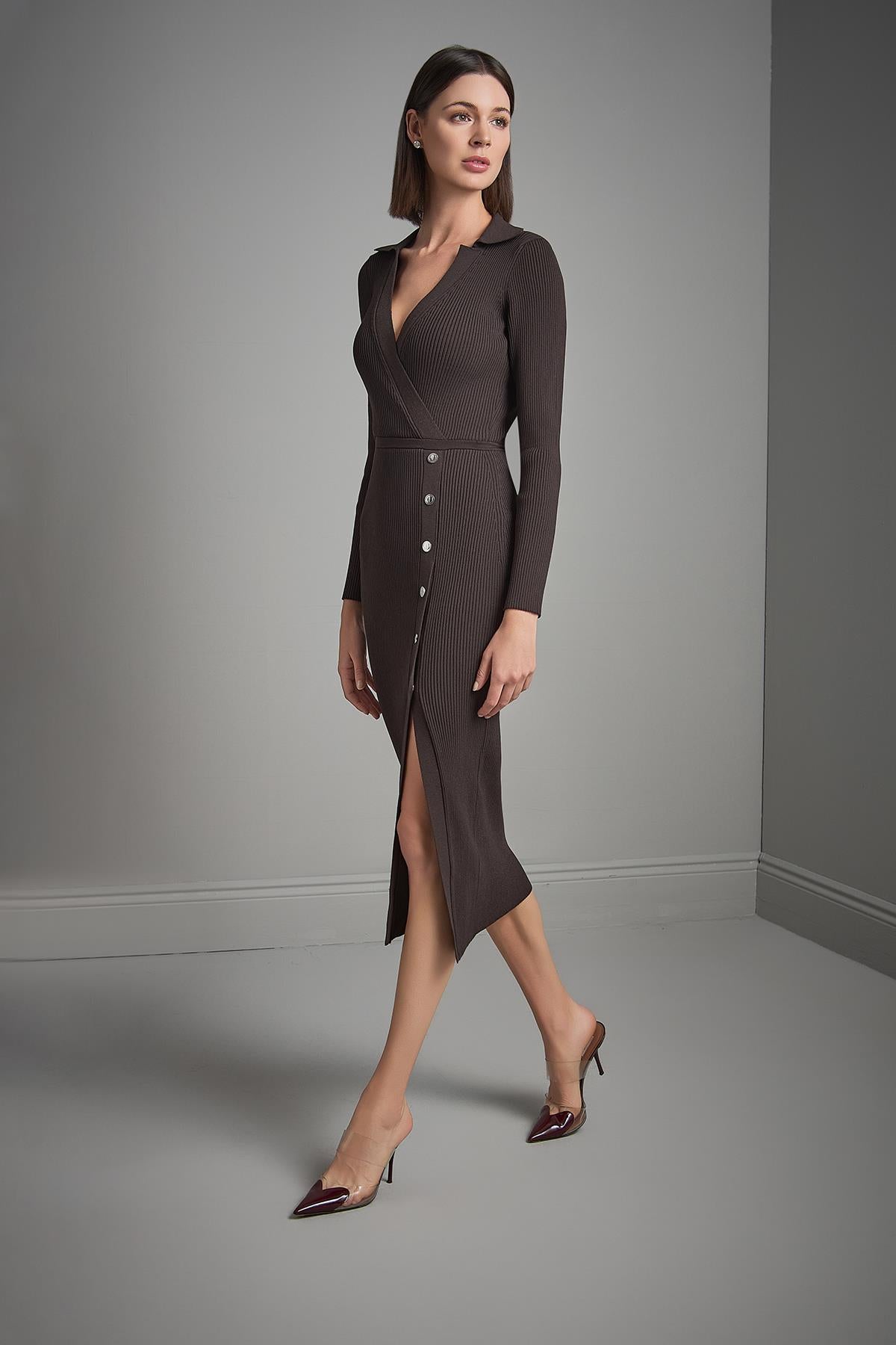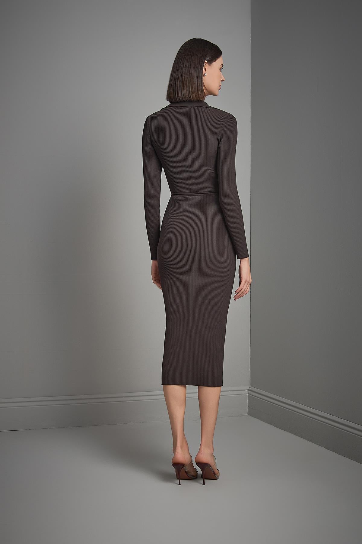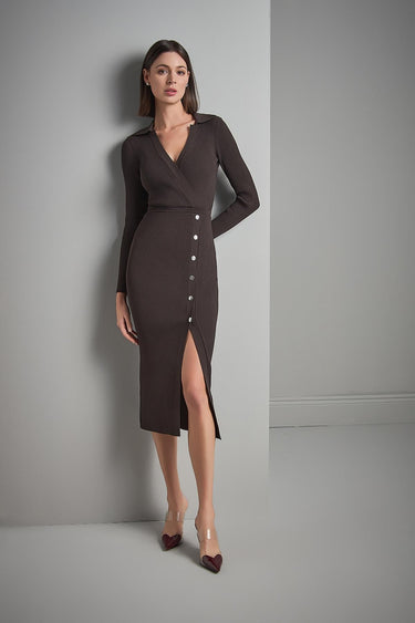 Polo Yaka Çıtçıt Detaylı Kahverengi Triko Elbise