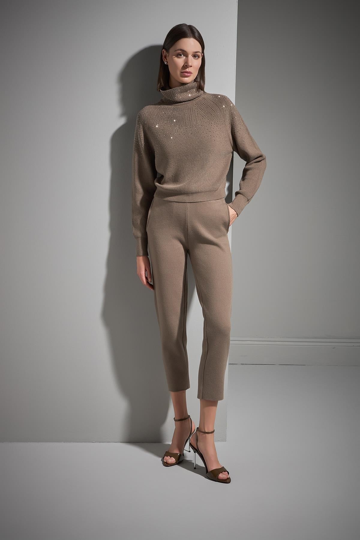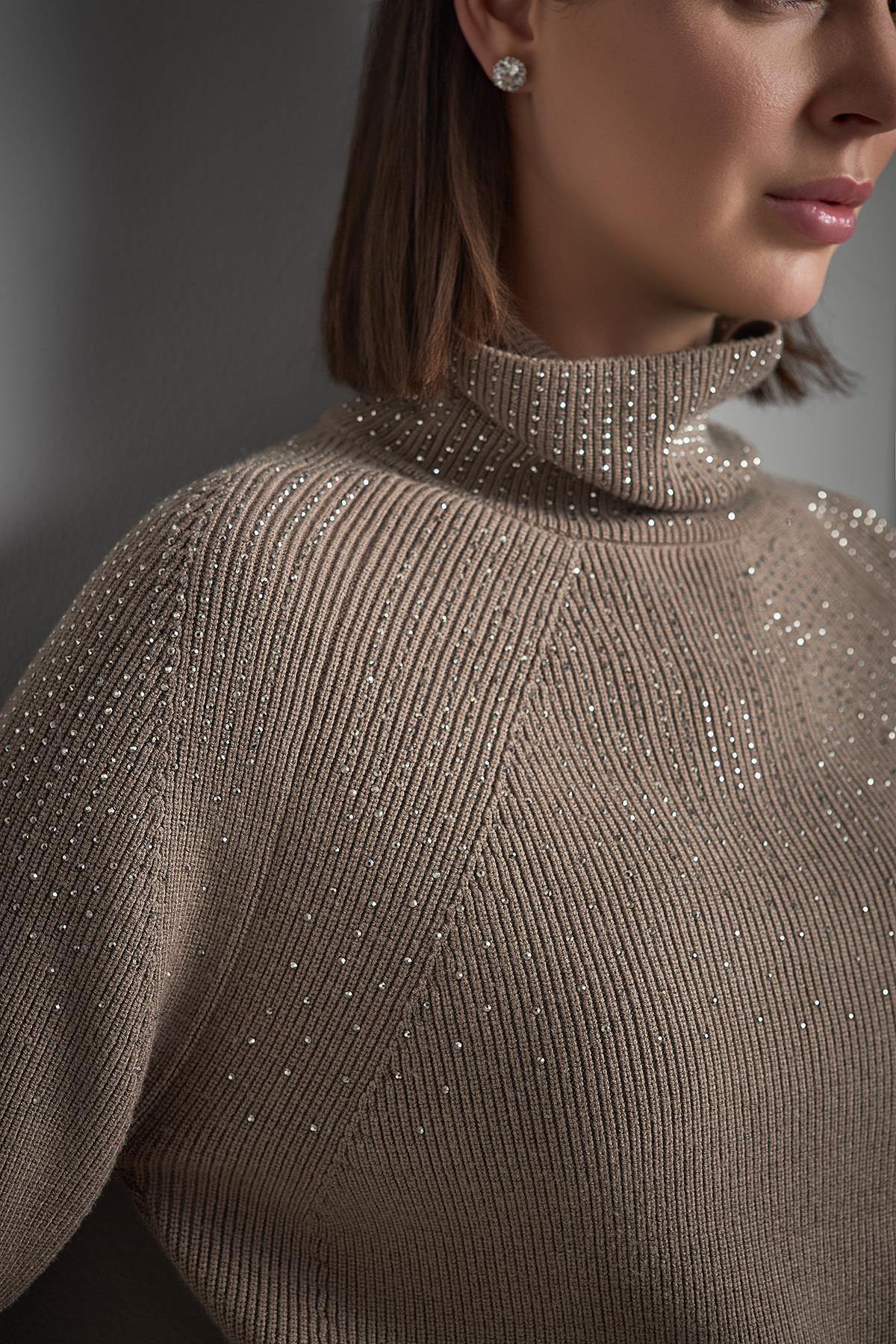 Taş Baskılı Boğazlı Kahverengi Triko Kazak